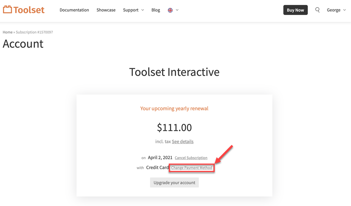 - Log into your Toolset account and click the Modify link next to your account overview.