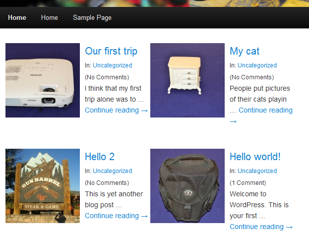 Yo he elegido un layout de grilla con dos columnas. He añadido el título de la entrada (con enlace), categoría, conteo de comentarios, imagen destacada y reseña. También he aplicado cierto CSS (con mis escasas habilidades en CSS). Este es el resultado.