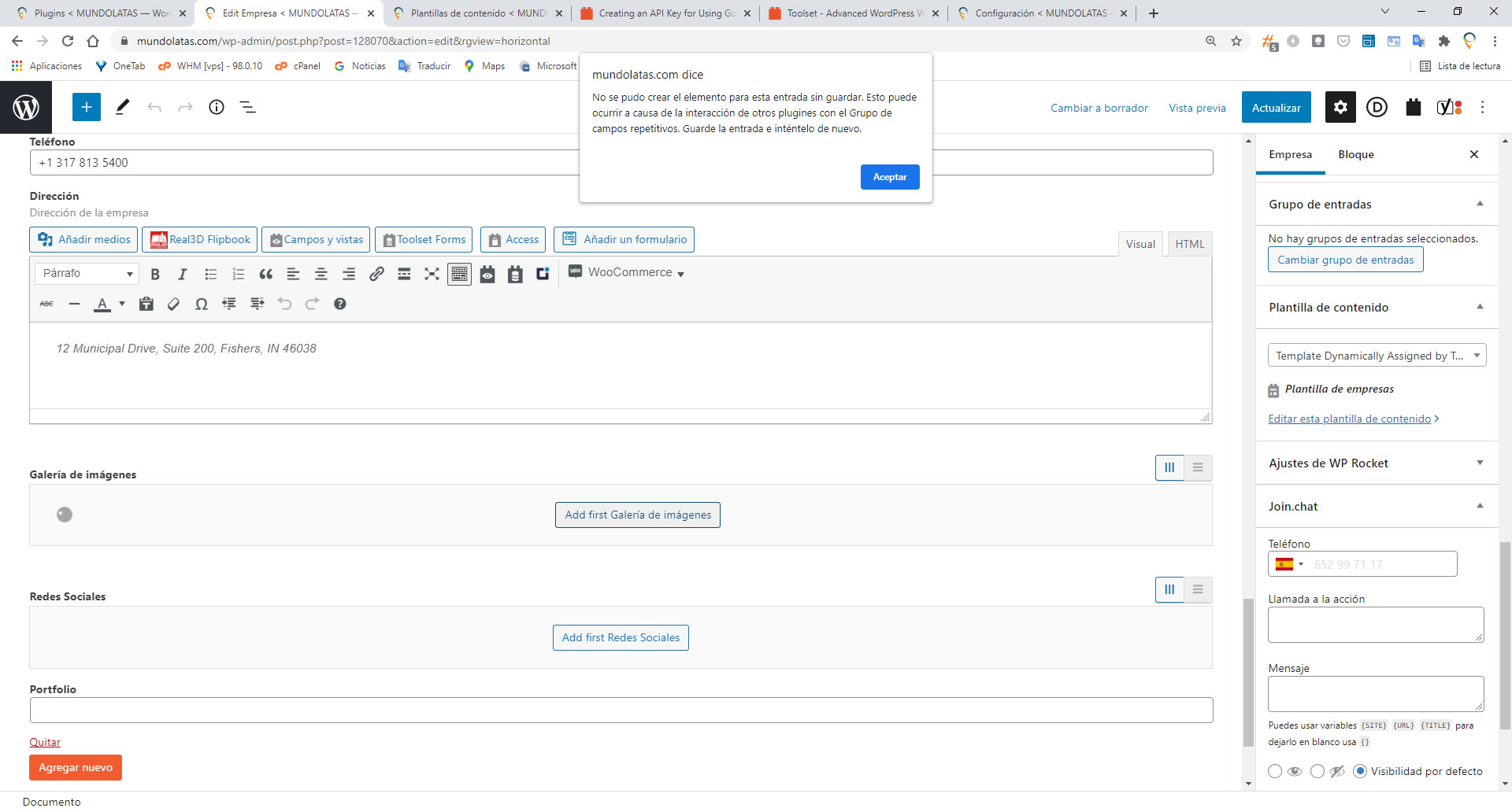 Could not create item for this entry without saving. This can occur due to the interaction of other plugins with the Repeating Field Group. Please save your entry and try again.