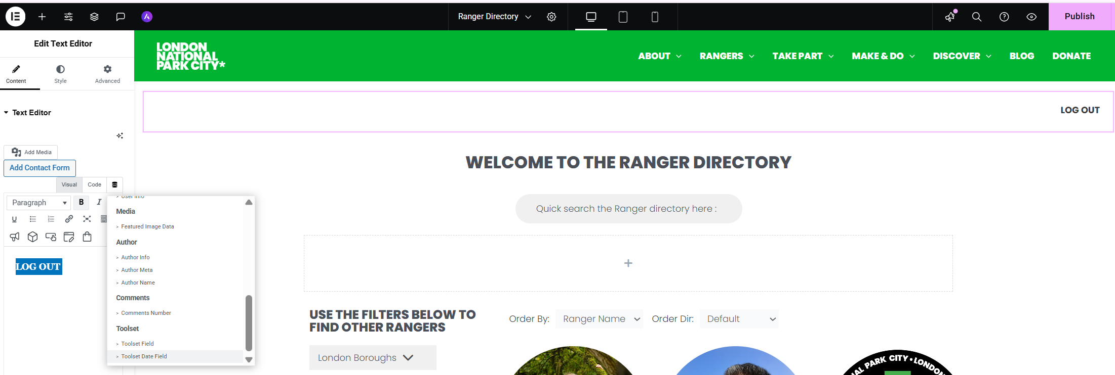 I have designed my directory on the front end using WordPress Elementor - how do I add a 'Log Out' button this way? I cant see how to add the dynamic tag to the text?