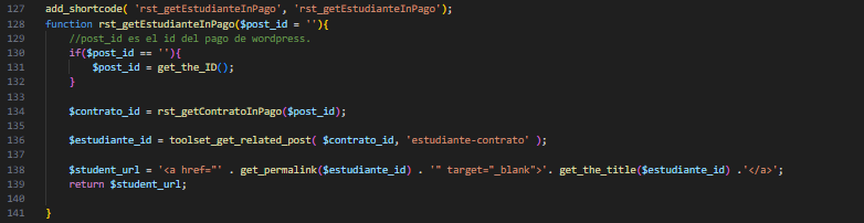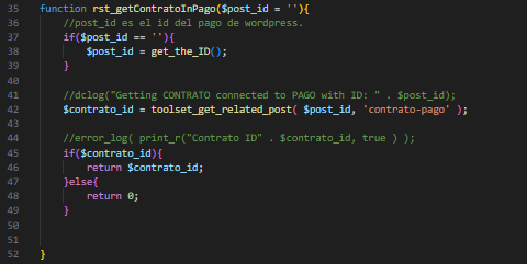 function rst_getContratoInPago($post_id = ''){ //post_id es el id del pago de wordpress. if($post_id == ''){ $post_id = get_the_ID(); } //dclog("Getting CONTRATO connected to PAGO with ID: " . $post_id); $contrato_id = toolset_get_related_post( $post_id, 'contrato-pago' ); //error_log( print_r("Contrato ID" . $contrato_id, true ) ); if($contrato_id){ return $contrato_id; }else{ return 0; } }