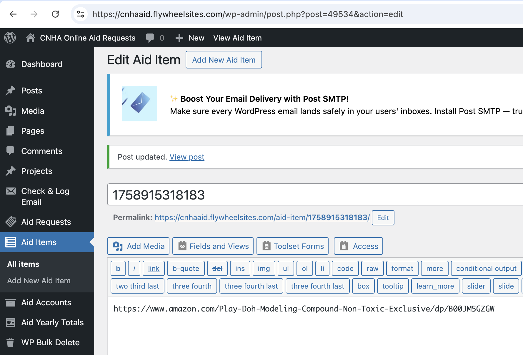 The system we're building with Toolset helps park staff procure funds for products they need to order. Sometimes they are ordering from Amazon and drop in an Amazon URL into the product description field of the order form. This field gets stored as the post body.