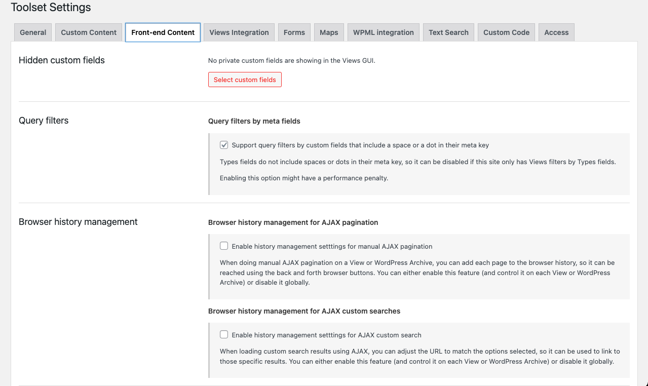 I find a section about Browser History Management in the Toolset settings, in the Font-end Content section.