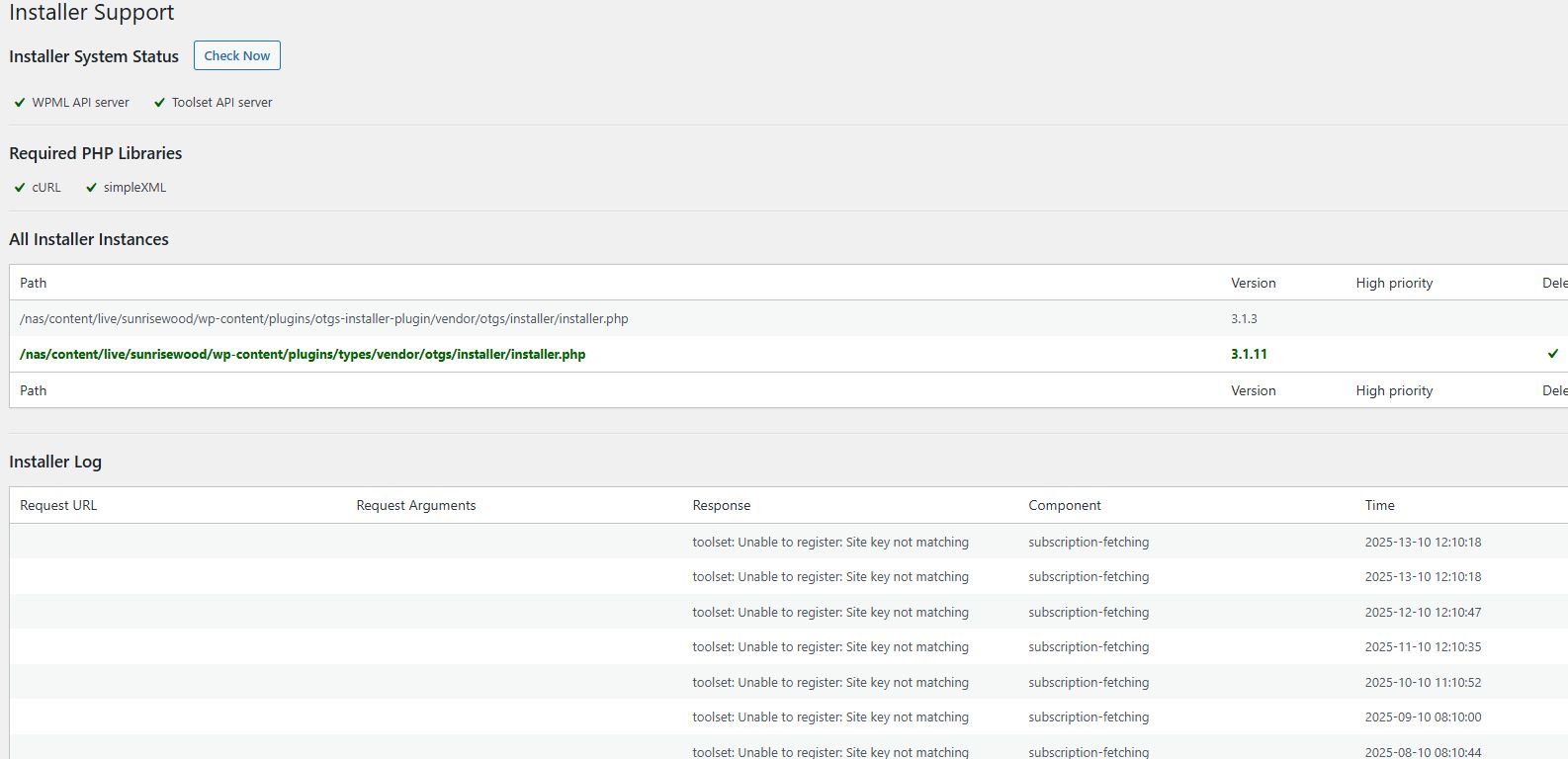 I followed the instructions in your support forum, installed the otgs plugin, toolset says that everything is registered , but I still get warning at the top of the plugins page that toolset plugin cannot connect to toolset.com due to site key not matching