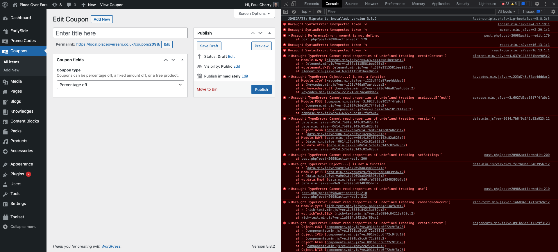 Link to a page where the issue can be seen: It's on a local install, but have included the debug text, as well as the errors that I'm seeing in console. Looks like a fair bit of JS conflict going on?