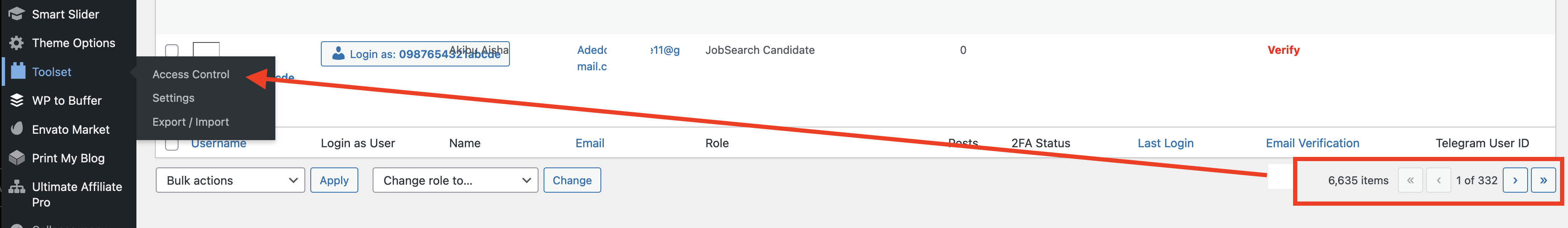 When I go to the backend admin, Users > All Users, it does not show me all the users registered on the site except I disable the Toolset Access plugin.