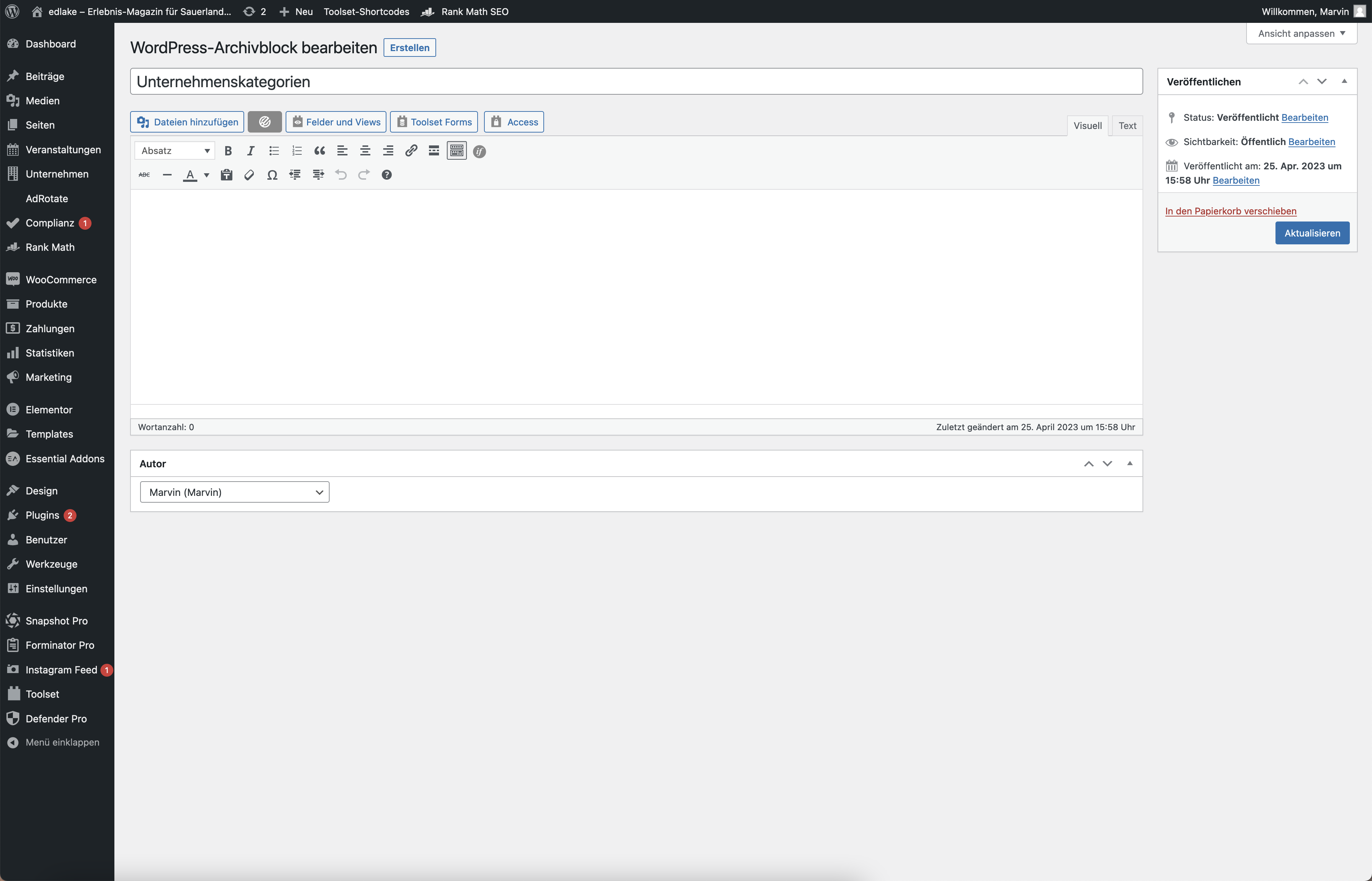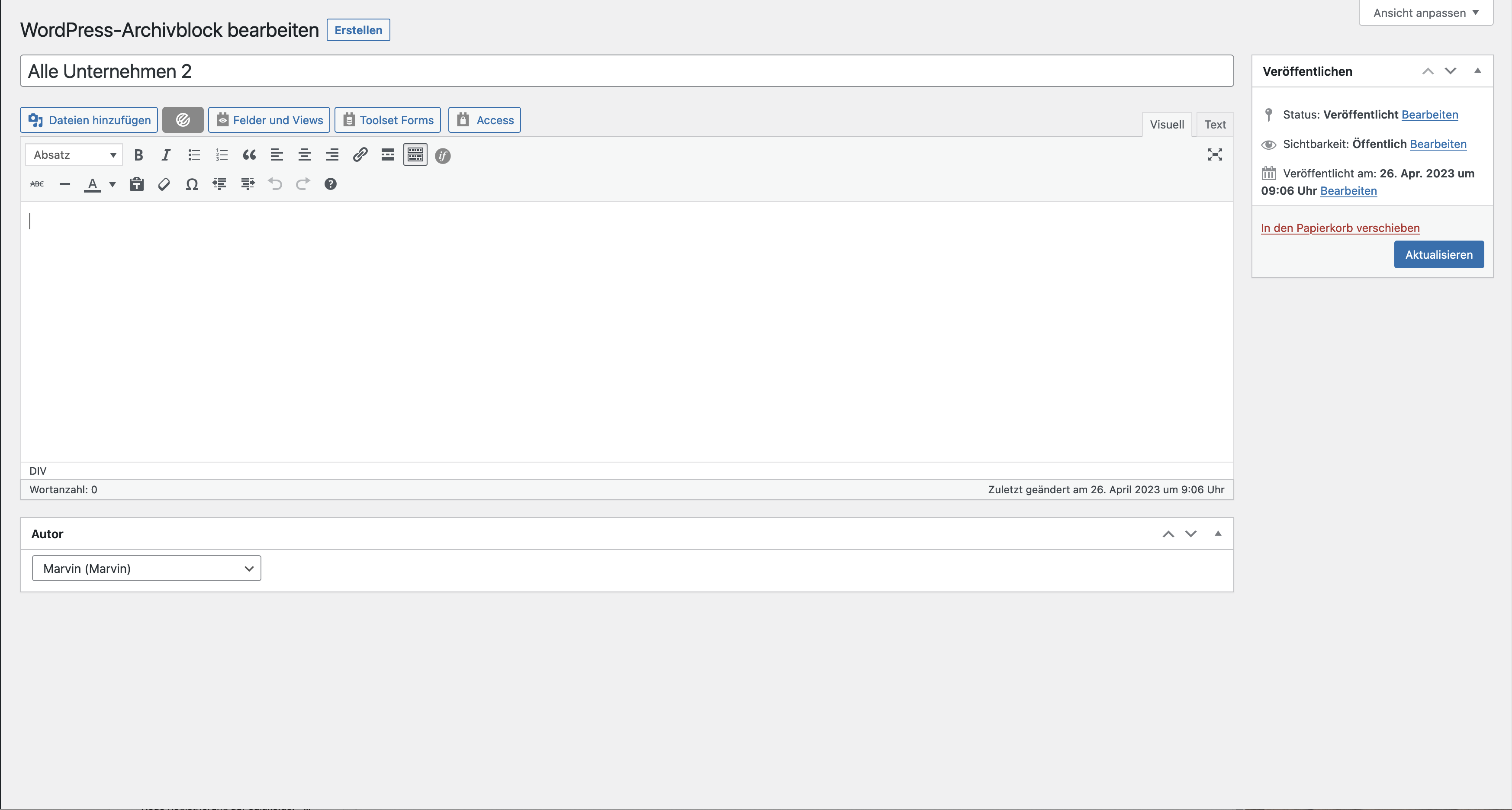 I want to create an Archive for my custom post type taxonomy "Art von Unternehmen". In the tutorial video (https://toolset.com/lesson-placement/lesson-placements-1621271-1622285/), after he clicks on "create archive", he is then brought to the familiar Toolset editor with a WordPress archive loop ready to add blocks, just like when creating views.