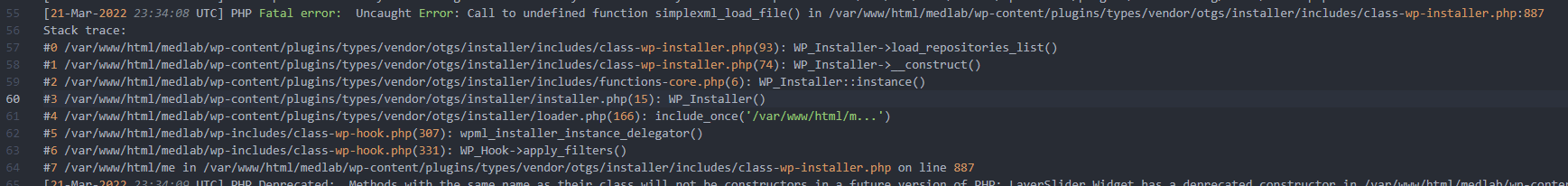 Fatal error: Uncaught Error: Call to undefined function simplexml_load_file() in /var/www/html/medlab/wp-content/plugins/types/vendor/otgs/installer/includes/class-wp-installer.php:887 Stack trace: #0 /var/www/html/medlab/wp-content/plugins/types/vendor/otgs/installer/includes/class-wp-installer.php(93): WP_Installer->load_repositories_list() #1 /var/www/html/medlab/wp-content/plugins/types/vendor/otgs/installer/includes/class-wp-installer.php(74): WP_Installer->__construct() #2 /var/www/html/medlab/wp-content/plugins/types/vendor/otgs/installer/includes/functions-core.php(6): WP_Installer::instance() #3 /var/www/html/medlab/wp-content/plugins/types/vendor/otgs/installer/installer.php(15): WP_Installer() #4 /var/www/html/medlab/wp-content/plugins/types/vendor/otgs/installer/loader.php(166): include_once('/var/www/html/m...') #5 /var/www/html/medlab/wp-includes/class-wp-hook.php(307): wpml_installer_instance_delegator() #6 /var/www/html/medlab/wp-includes/class-wp-hook.php(331): WP_Hook->apply_filters() #7 /var/www/html/me in /var/www/html/medlab/wp-content/plugins/types/vendor/otgs/installer/includes/class-wp-installer.php on line 887