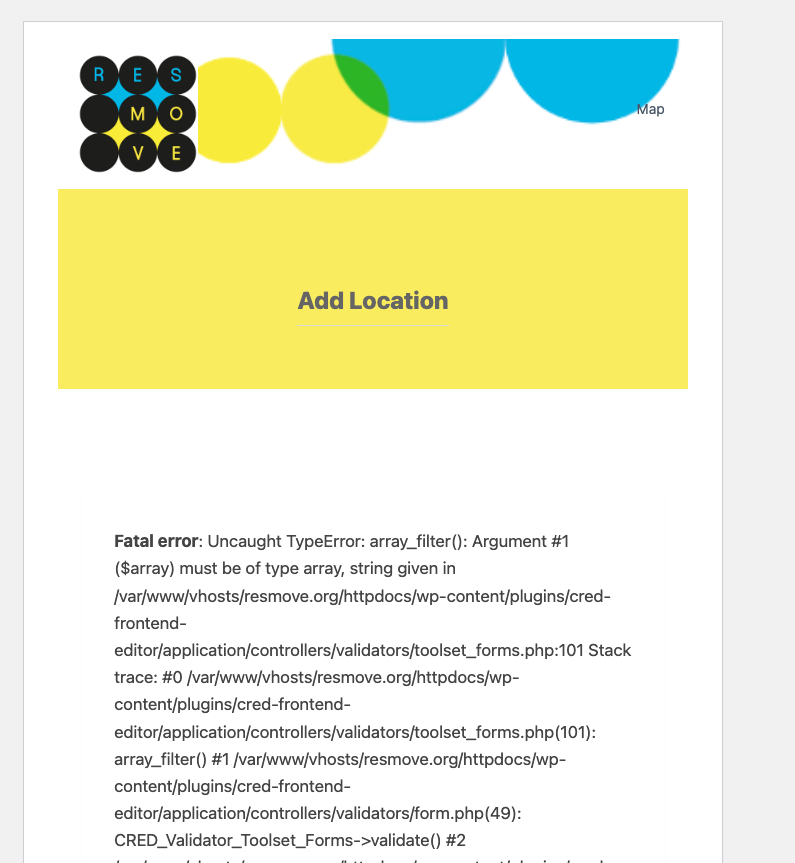 PHP Fatal error: Uncaught TypeError: array_filter(): Argument #1 ($array) must be of type array, string given in /var/www/vhosts/resmove.org/httpdocs/wp-content/plugins/cred-frontend-editor/application/controllers/validators/toolset_forms.php:101 #0 /var/www/vhosts/resmove.org/httpdocs/wp-content/plugins/cred-frontend-editor/application/controllers/validators/toolset_forms.php(101): array_filter() #1 /var/www/vhosts/resmove.org/httpdocs/wp-content/plugins/cred-frontend-editor/application/controllers/validators/form.php(49): CRED_Validator_Toolset_Forms->validate() #2 /var/www/vhosts/resmove.org/httpdocs/wp-content/plugins/cred-frontend-editor/application/models/form/base.php(974): CRED_Validator_Form->validate() #3 /var/www/vhosts/resmove.org/httpdocs/wp-content/plugins/cred-frontend-editor/application/models/form/base.php(423): CRED_Form_Base->validate_form() #4 /var/www/vhosts/resmove.org/httpdocs/wp-content/plugins/cred-frontend-editor/application/controllers/form_builder_base.php(42): CRED_Form_Base->print_form() #5 /var/www/vhosts/resmove.org/httpdocs/wp-content/plugins/cred-frontend-editor/application/controllers/ajax/handler/submit_form.php(47): CRED_Form_Builder_Base->get_form() #6 /var/www/vhosts/resmove.org/httpdocs/wp-content/plugins/cred-frontend-editor/vendor/toolset/toolset-common/inc/toolset.ajax.class.php(264): CRED_Ajax_Handler_Submit_Form->process_call() #7 /var/www/vhosts/resmove.org/httpdocs/wp-includes/class-wp-hook.php(324): Toolset_Ajax->__call() #8 /var/www/vhosts/resmove.org/httpdocs/wp-includes/class-wp-hook.php(348): WP_Hook->apply_filters() #9 /var/www/vhosts/resmove.org/httpdocs/wp-includes/plugin.php(517): WP_Hook->do_action() #10 /var/www/vhosts/resmove.org/httpdocs/wp-admin/admin-ajax.php(192): do_action() #11 {main} thrown in /var/www/vhosts/resmove.org/httpdocs/wp-content/plugins/cred-frontend-editor/application/controllers/validators/toolset_forms.php on line 101
