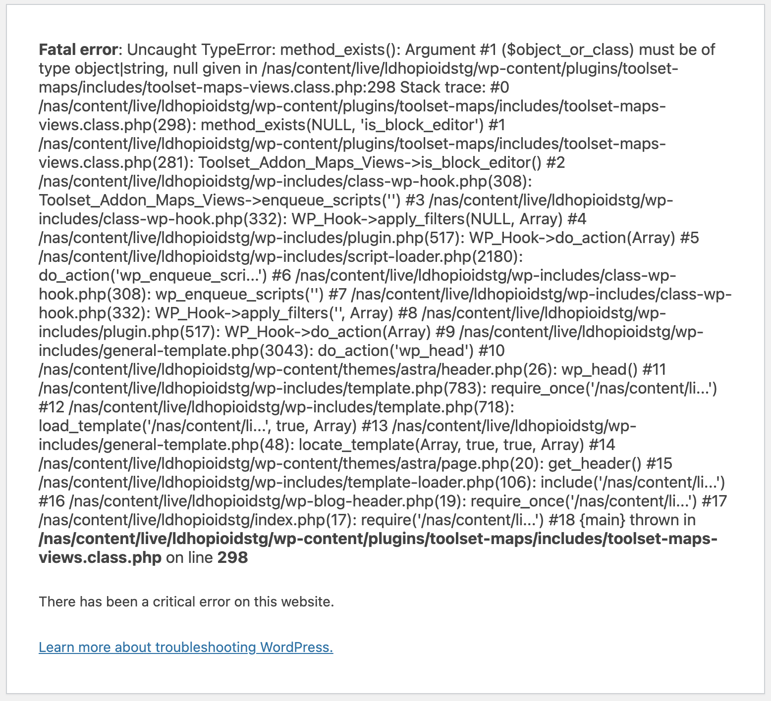 Fatal error: Uncaught TypeError: method_exists(): Argument #1 ($object_or_class) must be of type object|string, null given in /nas/content/live/ldhopioidstg/wp-content/plugins/toolset-maps/includes/toolset-maps-views.class.php:298 Stack trace: #0 /nas/content/live/ldhopioidstg/wp-content/plugins/toolset-maps/includes/toolset-maps-views.class.php(298): method_exists(NULL, 'is_block_editor') #1 /nas/content/live/ldhopioidstg/wp-content/plugins/toolset-maps/includes/toolset-maps-views.class.php(281): Toolset_Addon_Maps_Views->is_block_editor() #2 /nas/content/live/ldhopioidstg/wp-includes/class-wp-hook.php(308): Toolset_Addon_Maps_Views->enqueue_scripts('') #3 /nas/content/live/ldhopioidstg/wp-includes/class-wp-hook.php(332): WP_Hook->apply_filters(NULL, Array) #4 /nas/content/live/ldhopioidstg/wp-includes/plugin.php(517): WP_Hook->do_action(Array) #5 /nas/content/live/ldhopioidstg/wp-includes/script-loader.php(2180): do_action('wp_enqueue_scri...') #6 /nas/content/live/ldhopioidstg/wp-includes/class-wp-hook.php(308): wp_enqueue_scripts('') #7 /nas/content/live/ldhopioidstg/wp-includes/class-wp-hook.php(332): WP_Hook->apply_filters('', Array) #8 /nas/content/live/ldhopioidstg/wp-includes/plugin.php(517): WP_Hook->do_action(Array) #9 /nas/content/live/ldhopioidstg/wp-includes/general-template.php(3043): do_action('wp_head') #10 /nas/content/live/ldhopioidstg/wp-content/themes/astra/header.php(26): wp_head() #11 /nas/content/live/ldhopioidstg/wp-includes/template.php(783): require_once('/nas/content/li...') #12 /nas/content/live/ldhopioidstg/wp-includes/template.php(718): load_template('/nas/content/li...', true, Array) #13 /nas/content/live/ldhopioidstg/wp-includes/general-template.php(48): locate_template(Array, true, true, Array) #14 /nas/content/live/ldhopioidstg/wp-content/themes/astra/page.php(20): get_header() #15 /nas/content/live/ldhopioidstg/wp-includes/template-loader.php(106): include('/nas/content/li...') #16 /nas/content/live/ldhopioidstg/wp-blog-header.php(19): require_once('/nas/content/li...') #17 /nas/content/live/ldhopioidstg/index.php(17): require('/nas/content/li...') #18 {main} thrown in /nas/content/live/ldhopioidstg/wp-content/plugins/toolset-maps/includes/toolset-maps-views.class.php on line 298