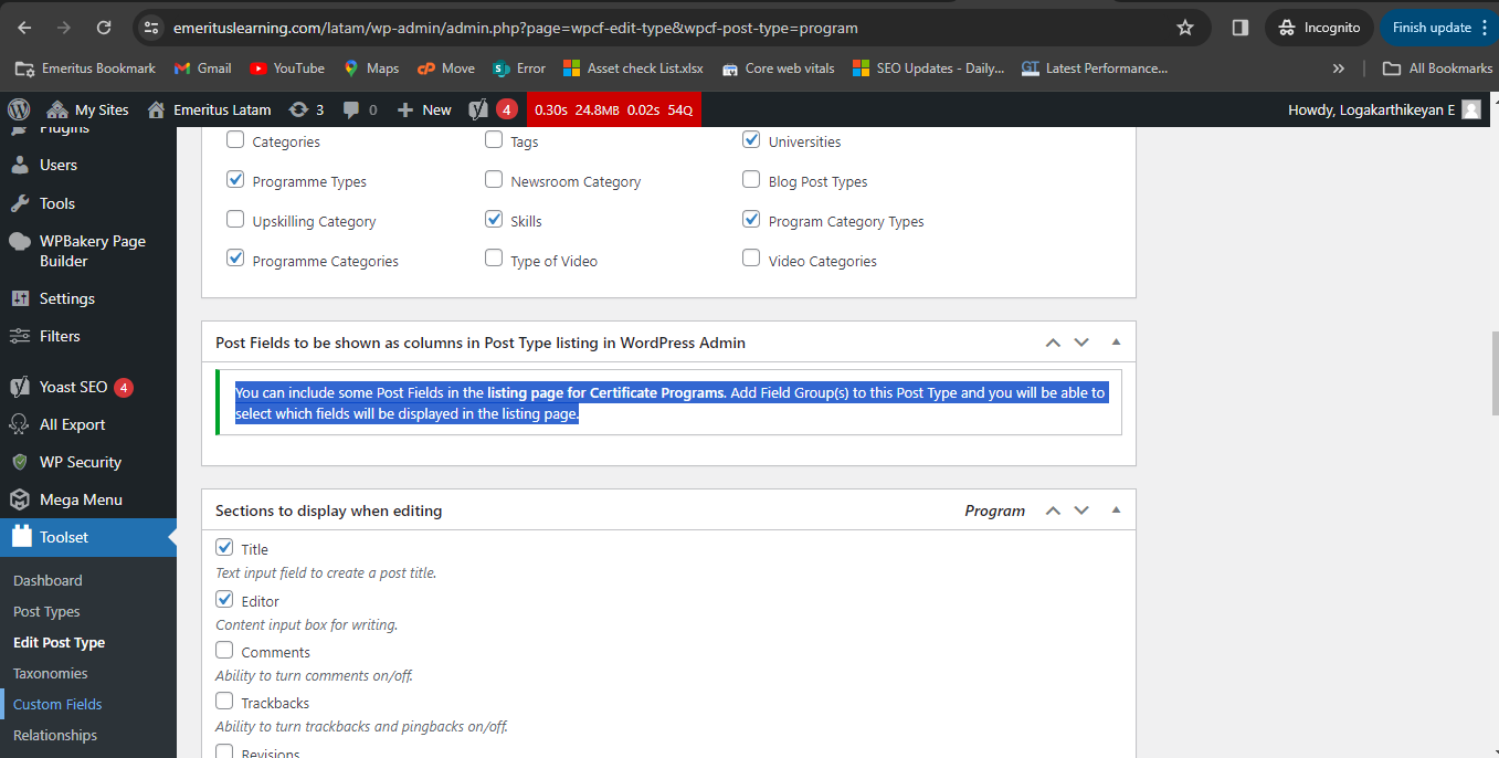 I have created the Custom fields in Toolset and also I have assigned it to Post type. But when I am seeing on post type the assigned fields are not visible. its showing this message "You can include some Post Fields in the listing page for Certificate Programs. Add Field Group(s) to this Post Type and you will be able to select which fields will be displayed in the listing page." Can you please help me on that.