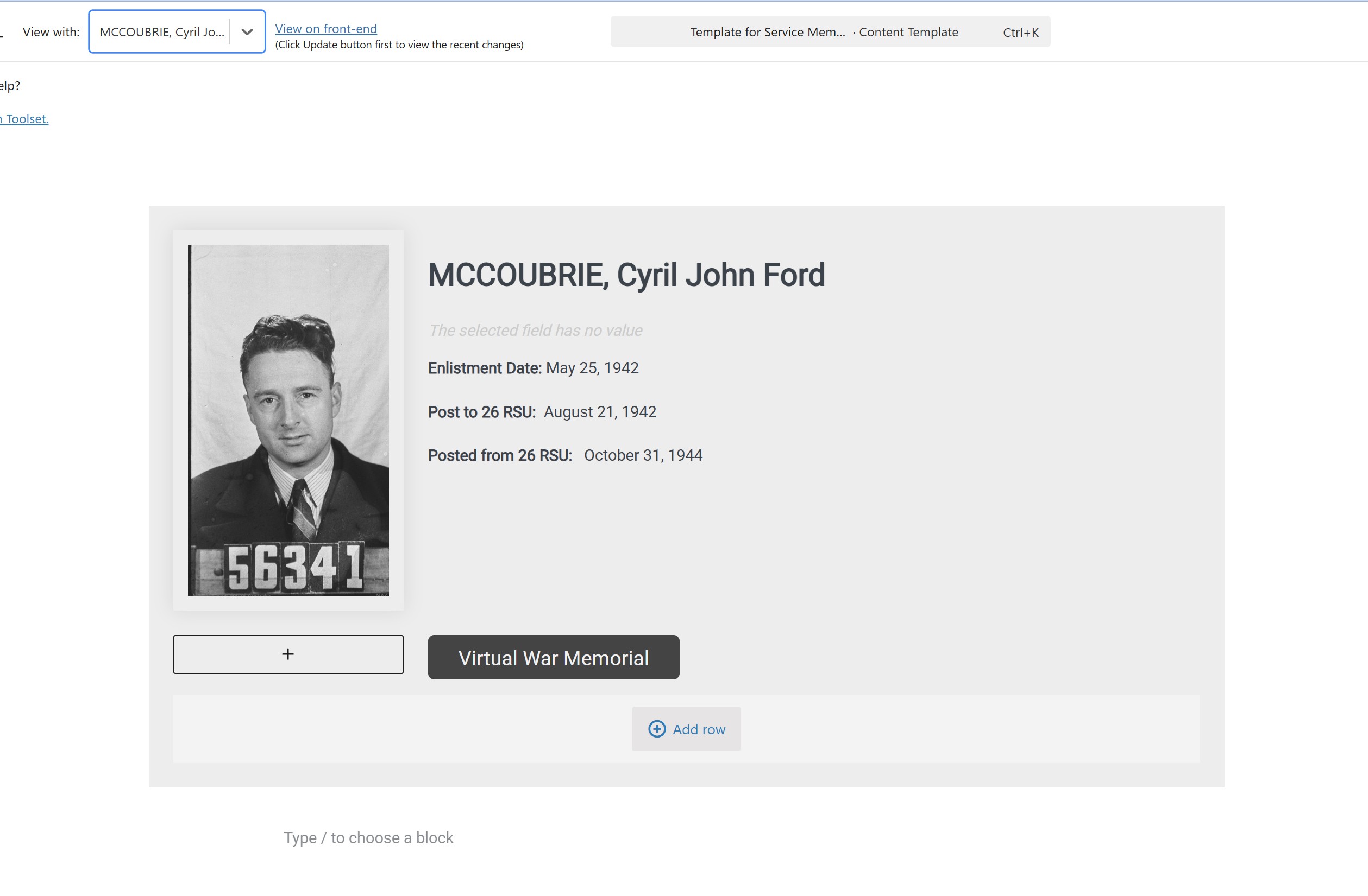 When I edit the template I created, (called 'Template for Service Members',) everything seems to work as advertised and I can toggle different service members (people) by using the 'View with' drop-down at the top of the page. It will show me all the different Service Members (a custom post type) However, if I click 'View on front end', it shows me nothing except the page title.