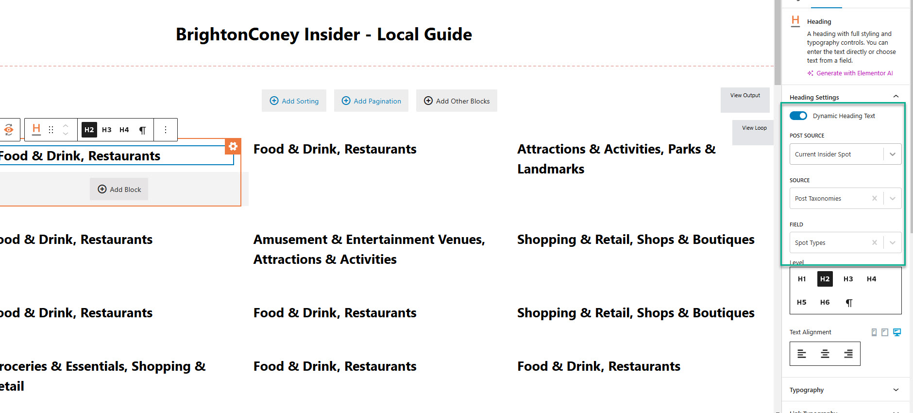 All I was able to do so far is create a loop block that shows the custom taxonomy of all posts (see screenshot).