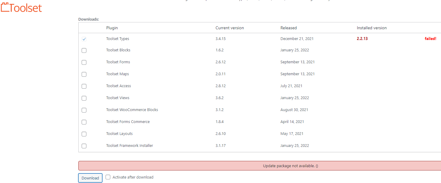 I am trying to: upgrade to the current version. just purchased new license. using the toolset interface in wordpress, the update won't download.