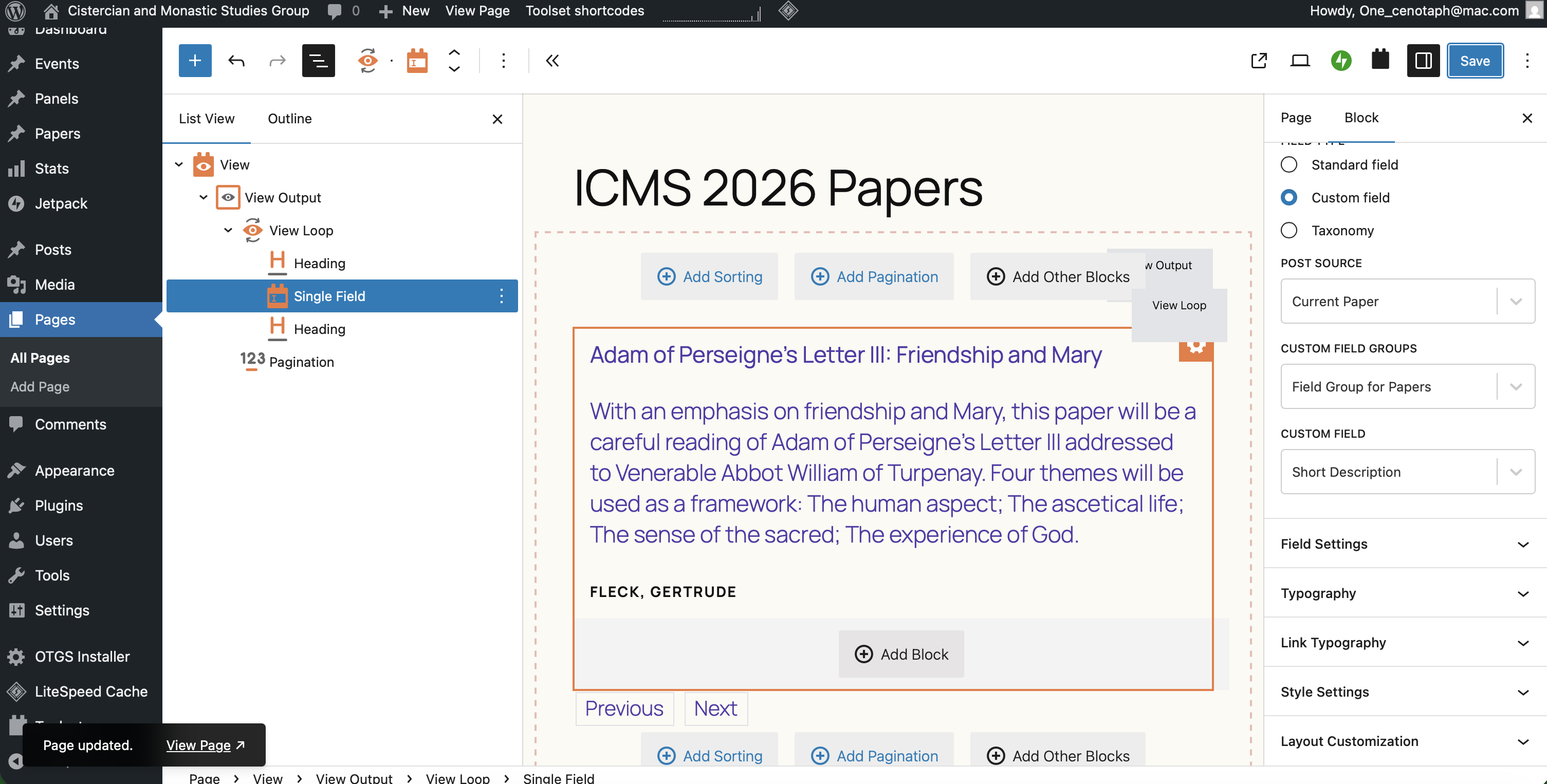 I expected to see: Content pulled from Current Paper, Field Group for Papers - Paper Title, Short Description, and Authors. I see the post content correctly on first load of the edited page, but if I refresh the page, the content disappears. You can select the page and see where the content should be.