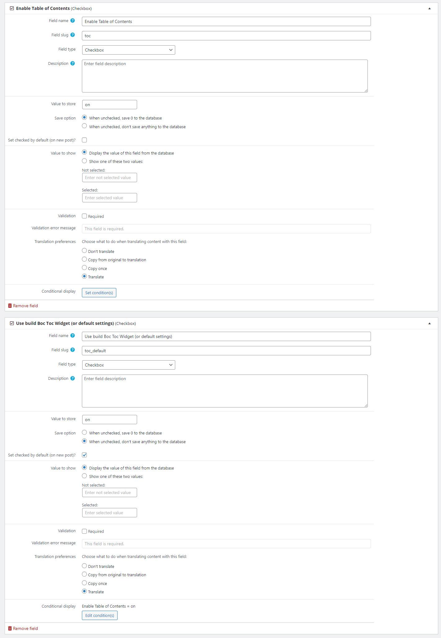 As you can see, "Use build Boc Toc Widget (or default settings) is conditionally displayed if "Enable Table of Contents" is checked. If "Use Boc Toc Widget (or default settings)" is not being displayed due to "Enable Table of Contents" not being checked when the post is saved, then when coming back to edit the post and checking "Enable Table of Contents", "use Boc Toc Widget will be conditionally displayed WITHOUT it's default value of checked.