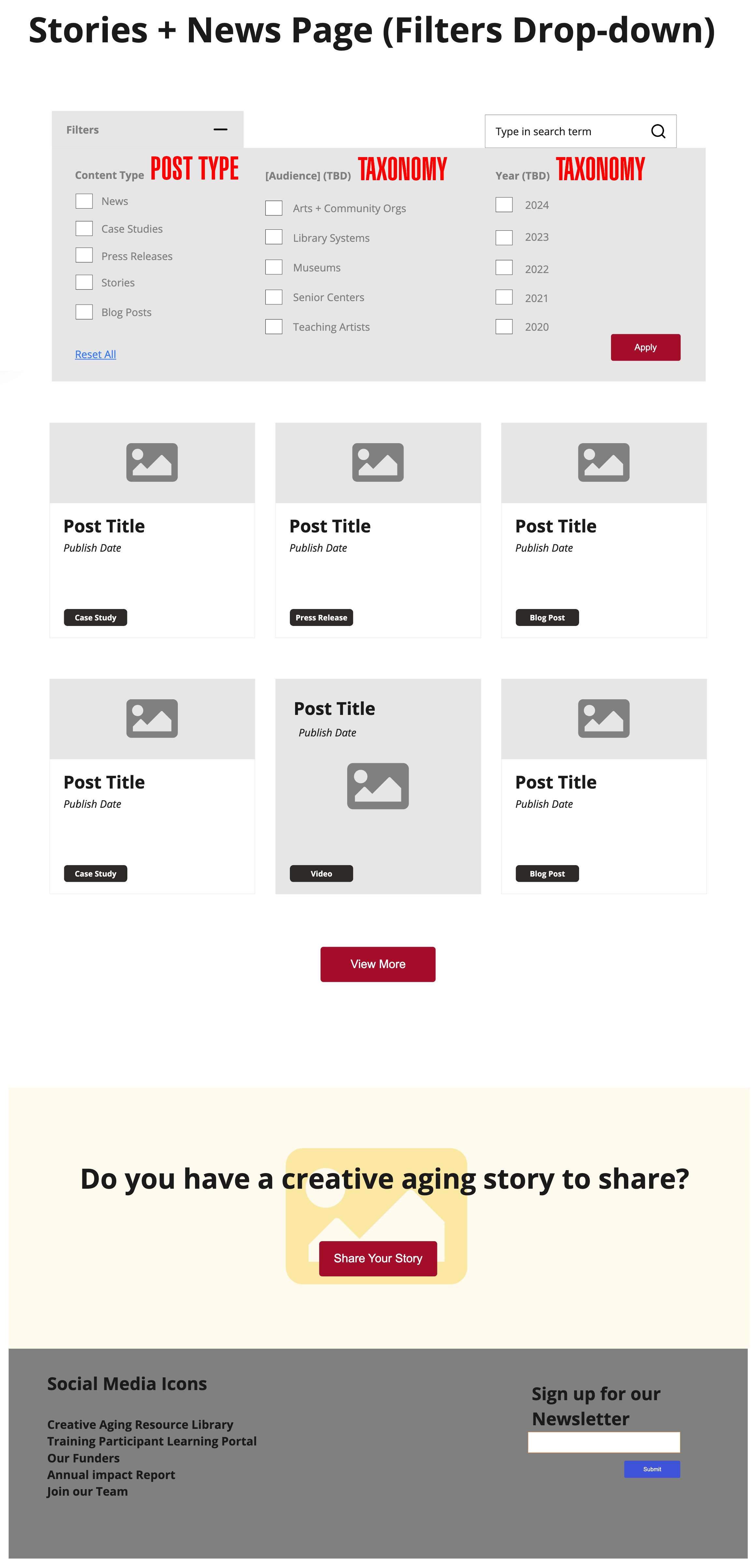 While testing the page a bit more, I discovered an issue with the filter: if I check multiple post types (e.g., both Stories and News Articles), only one post / post type appears. I think I just need to adjust your code like so: