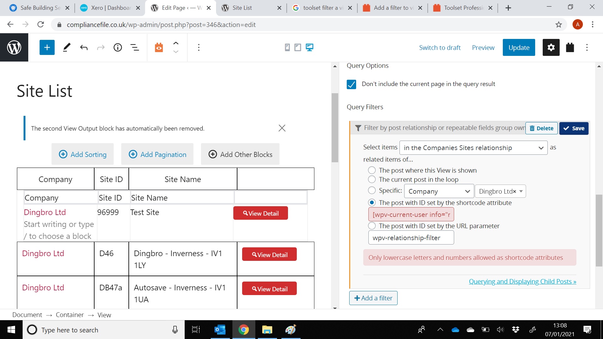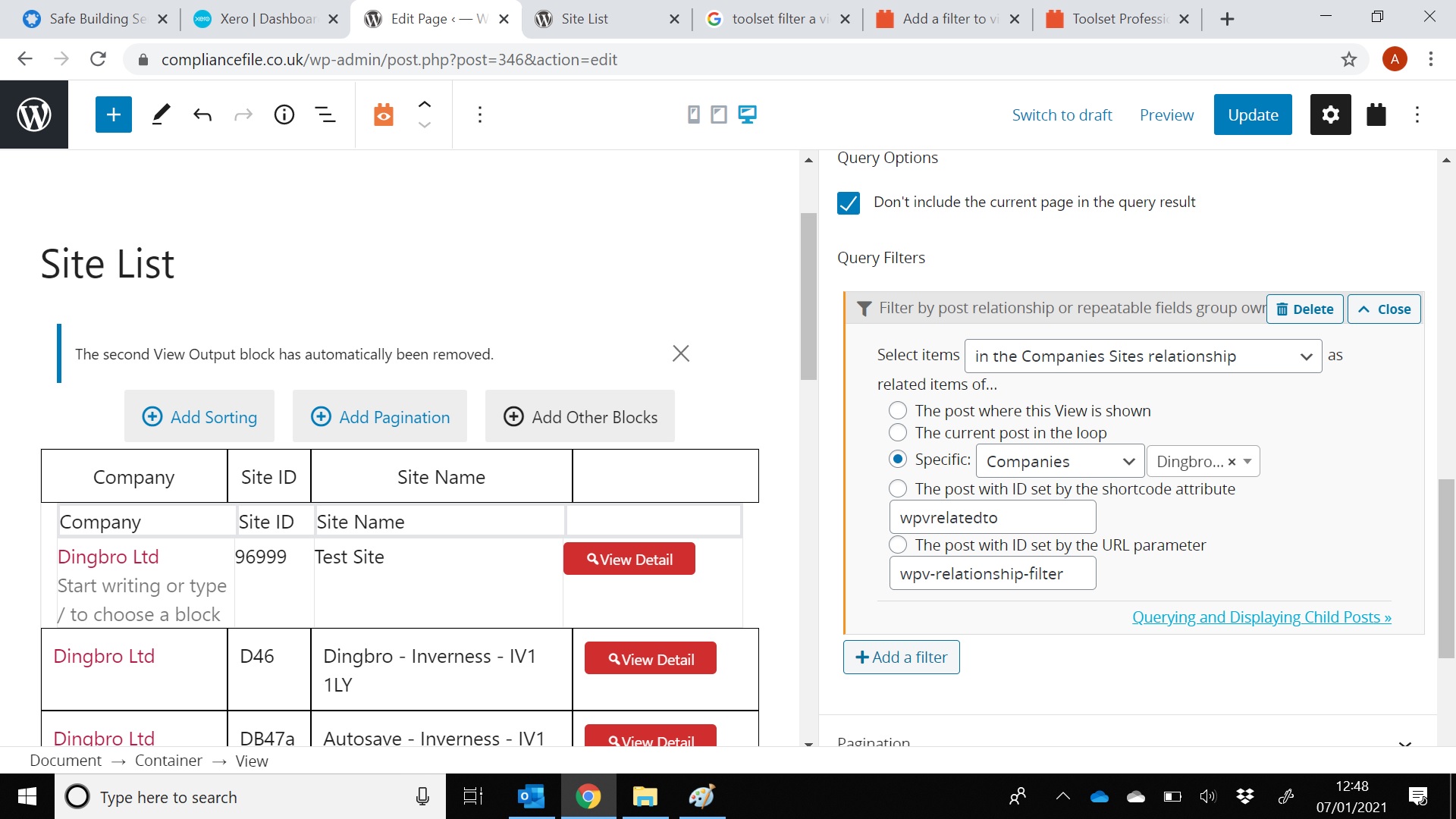 I have two custom post types, Companies and Sites, Sites is a one to many child relationship of Companies i.e. a company can have multiple sites. I have created a view called site list as shown in screenshot 1. I want to be be able to filter this view based on the logged in user , where by the user drives what Companies can be seen.