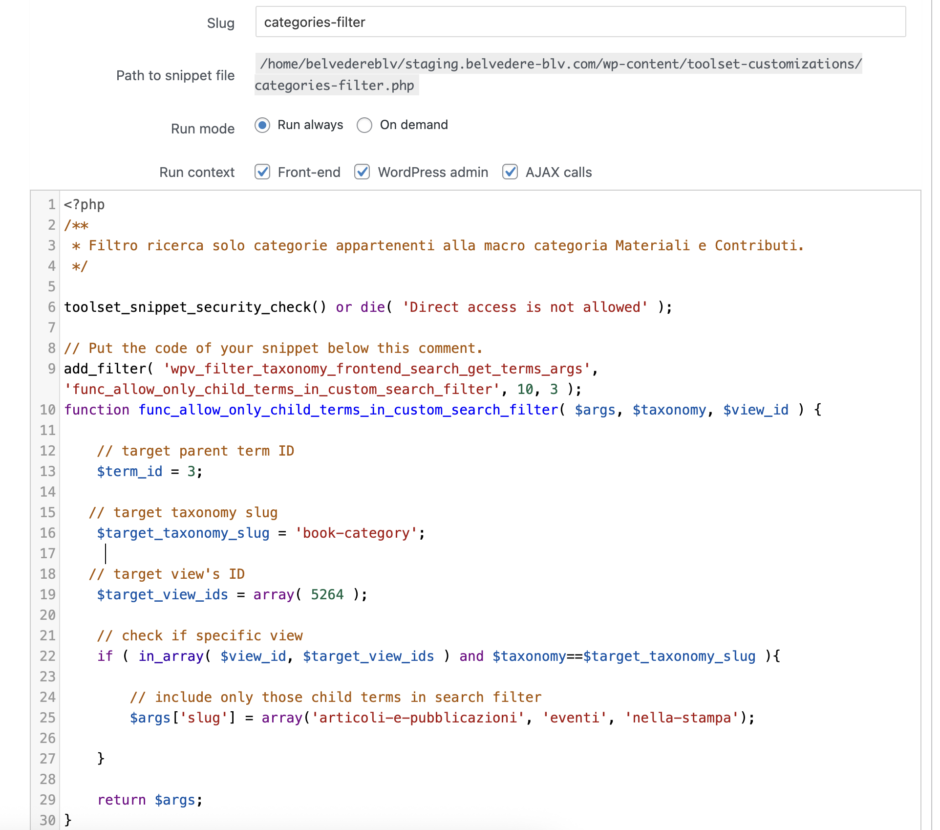 2) would you please re-write the script indicating an array of more than one child categories? the parent categfory ID is 3 and and some of the child categories slugs are: articoli-e-pubblicazioni, eventi, nella-stampa.