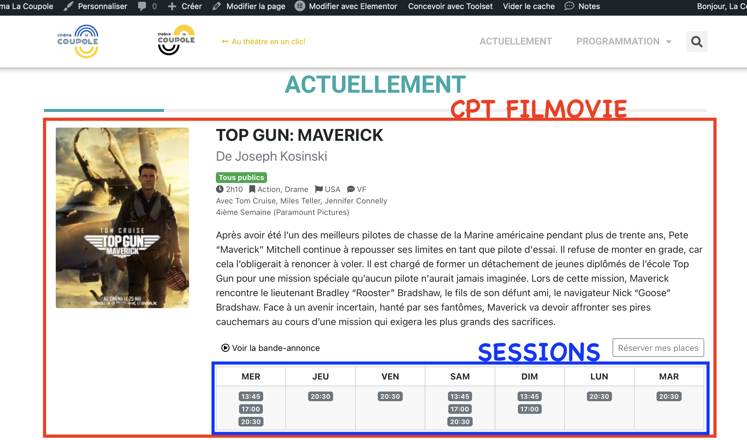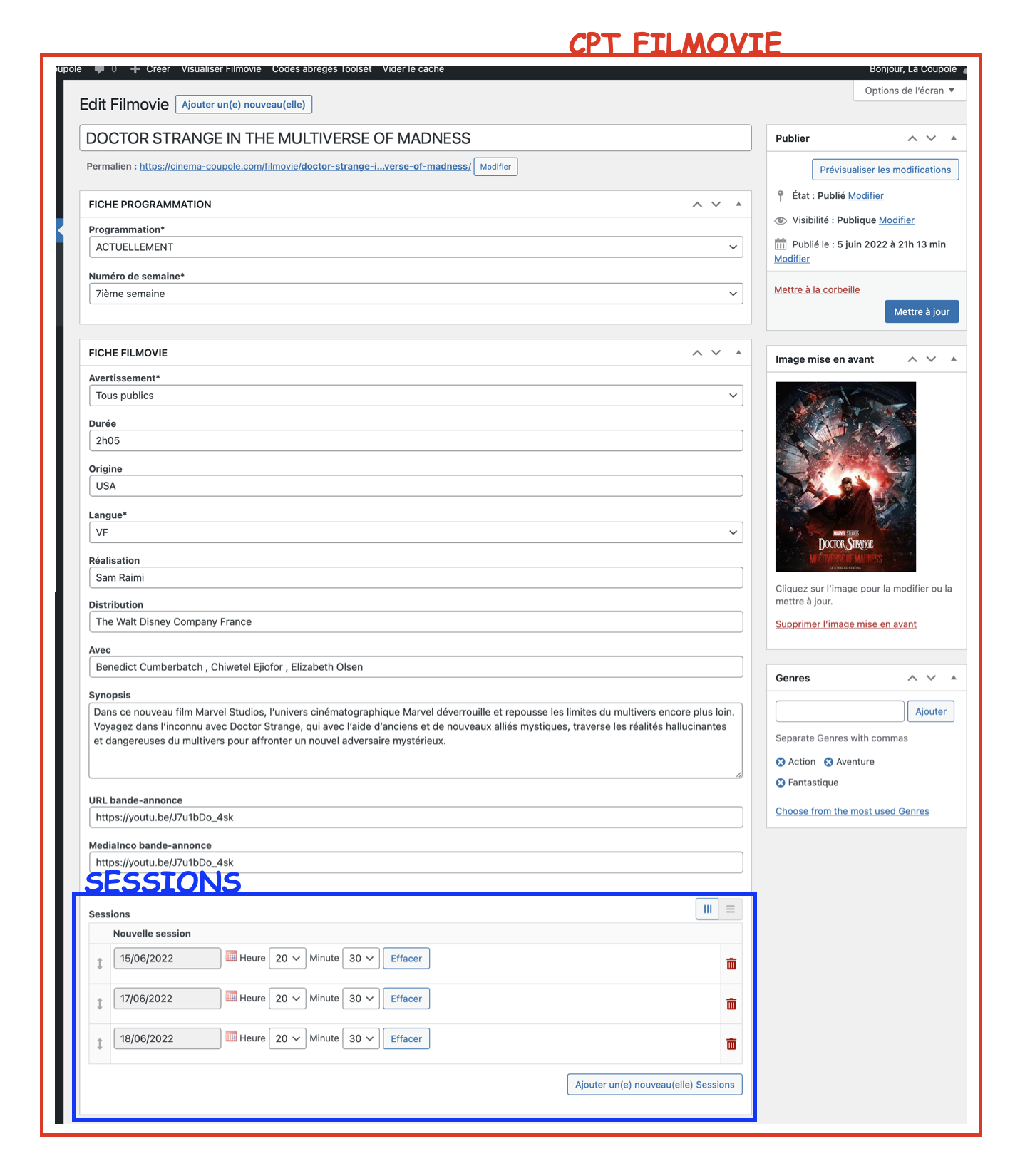 To go further in the use of Toolset and the personalization of the site, I added a 'group of repeatable fields' in the CPT 'Filmovie': 'SessionV2'.