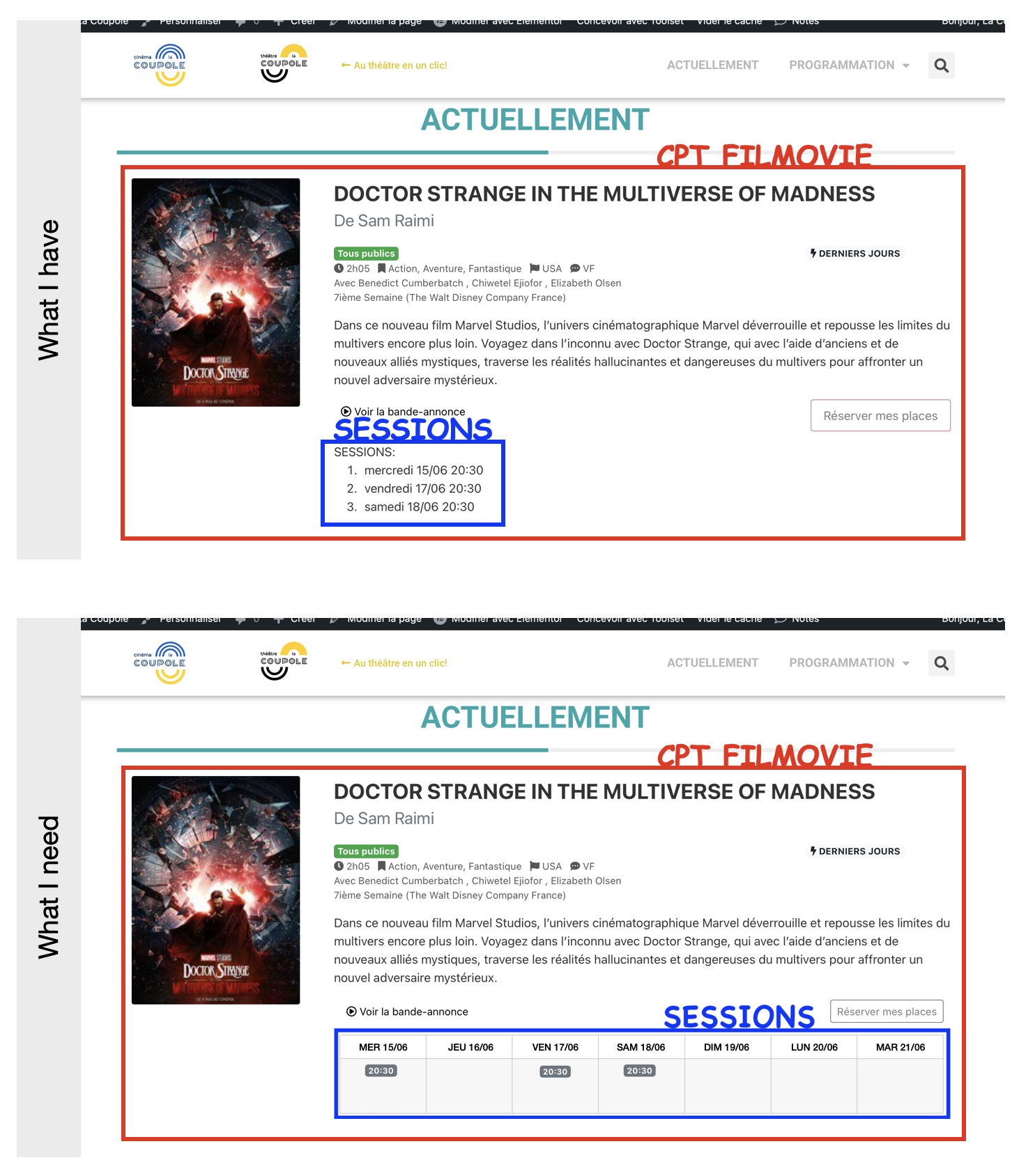 Now, I can display in the loop the schedules of all the sessions ("session-date-ts" fields in the cpt "Filmovie").