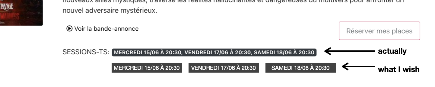 [wpv-for-each field="wpcf-session-date-ts"]<span class="badge badge-dark lessessions">[types field='session-date-ts' style='text' format='l d/m à H:i'][/types]</span> [/wpv-for-each]