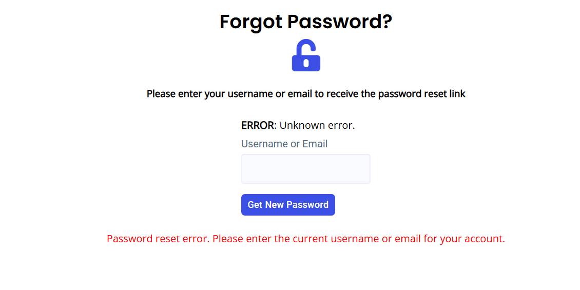 However, when a user attempts to submit the form, it consistently returns an error message stating: "Username not found."