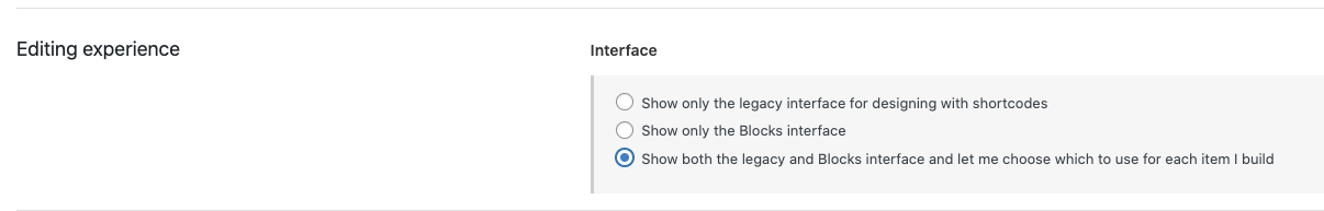 Show both the legacy and Blocks interface and let me choose which to use for each item I build