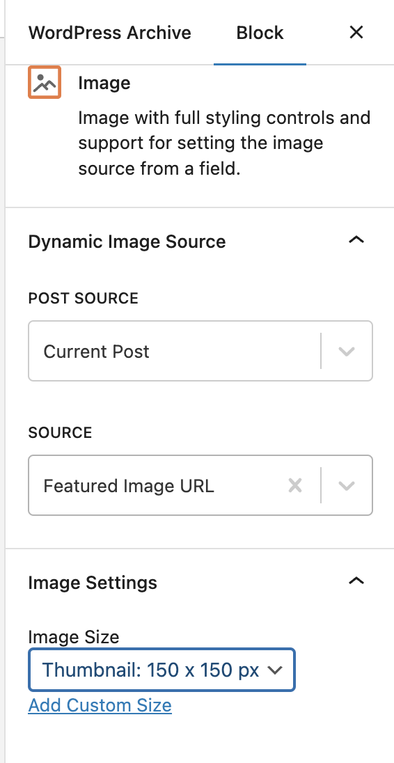 how do i style (select smaller size) for a featured image field, in a toolset post archive template?
