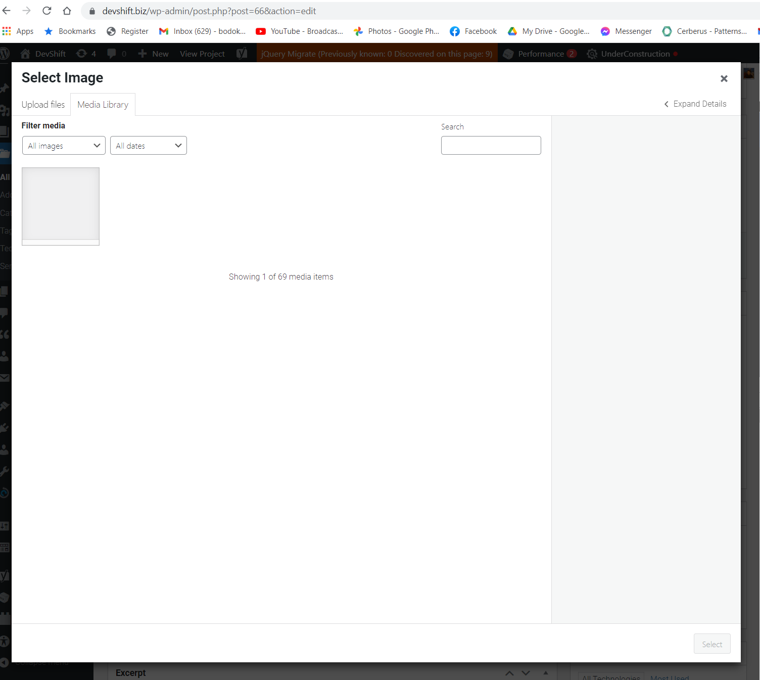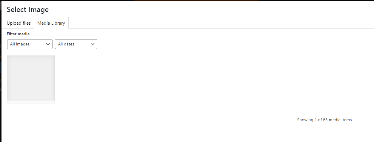 2. Add image button (ACF) which results in the "Showing 1 of 69 media items" but only shows 1 empty image.