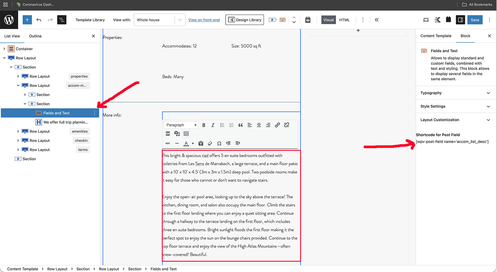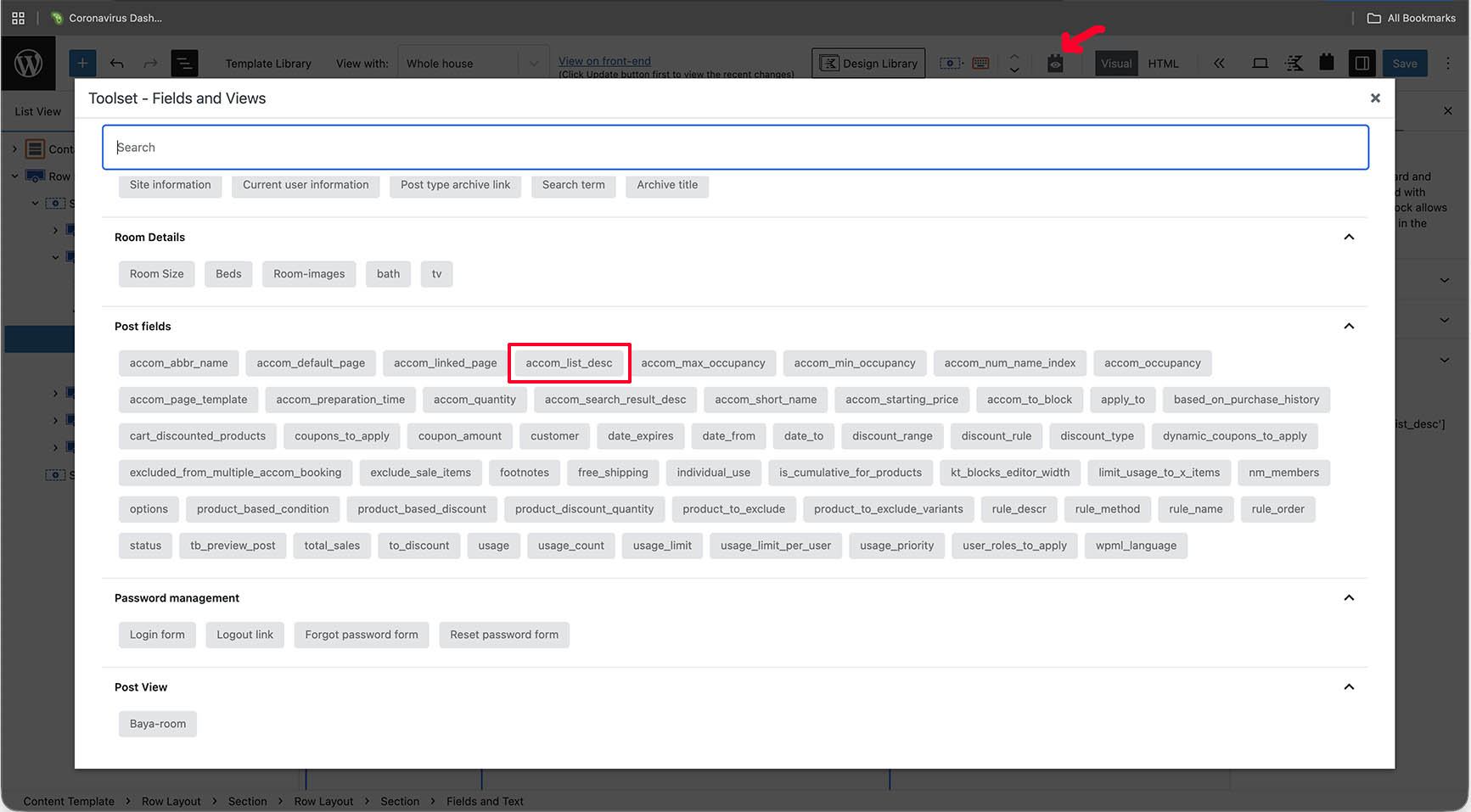 I have a Toolset Fields and Text block inserted into a template. It shows it is displaying this shortcode: wpv-post-field name='accom_list_desc'