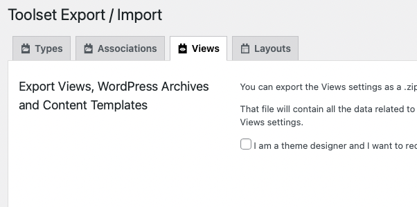 We just purchased toolset for one site and we're trying to export/import settings (type, view etc) from another site. On the site we're exporting from we have the option to export a view (see screenshot)but there's no tab for this on the new site (see screenshot). The individual plug-ins seem different between sites - on the old one there's a separate plug-in for views but on the new one it's part of Toolset blocks.