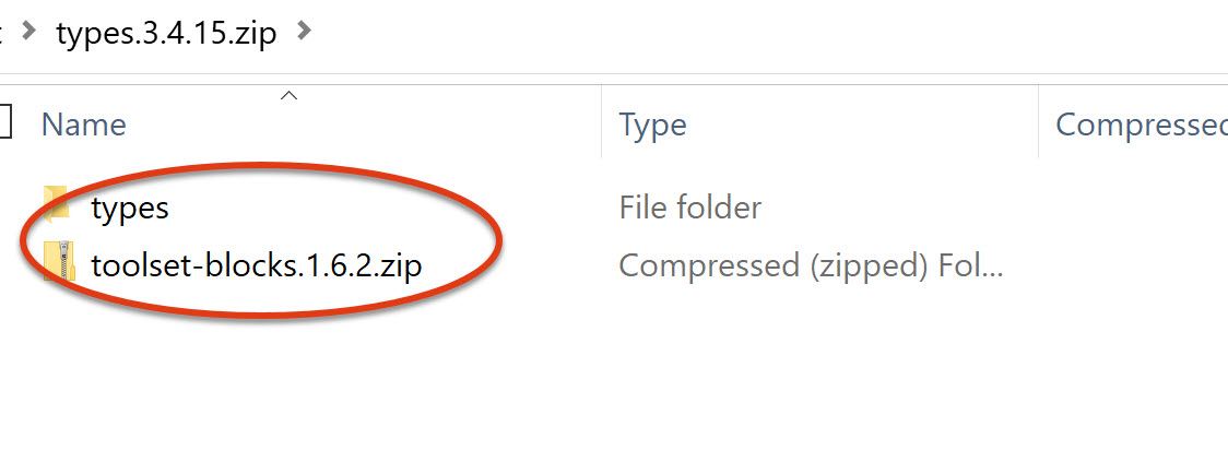 I have seen similar issues to this in the past, and opened the zip file, and saw toolset-blocks.1.6.2.zip (which is the same as another plugin I downloaded). Please a folder named types.