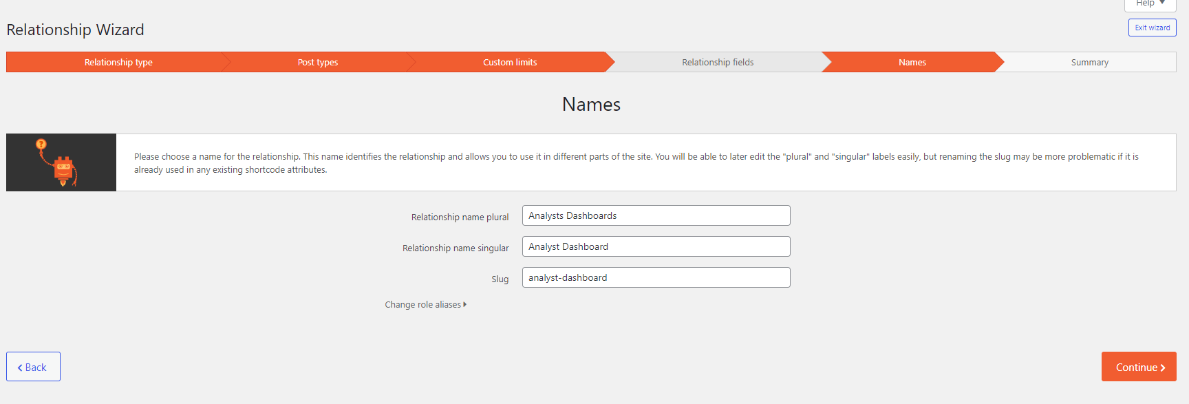 I created a CPT called Analysts, and a CPT called Dashboards. They both have one common field that I am wanting to use to create a relationship. Analysts is the left CPT, Dashboards is the right CPT, and it is a one-to-many relationship. For some reason, the Relationship Wizard is skipping the 'Relationship fields' step. Please see image. Why is the Wizard skipping this step? I tried following the relationship video tutorial and this is how I realized the Wizard is skipping that step (https://toolset.com/lesson-placement/lesson-placements-1729033-1727273/)