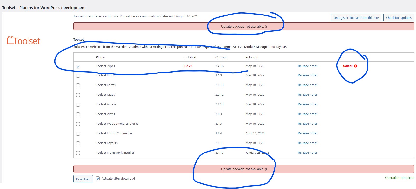 I just purchased toolset types. I am trying to update the version I have 2.2.3 to the current version 3.4.16 - but I get a failed message (see screenshot) - what should I do now? there is no indication as to how to proceed.