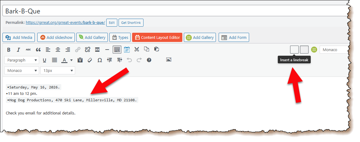 In the meantime I'm sending screenshots showing what the page looks like when published (no line breaks); and what it looks like in WordPress (with line breaks). In addition, the "Insert a Linebreak" option is not available in WP. I used the Enter and Shift+Enter but it doesn't show up on the published page.