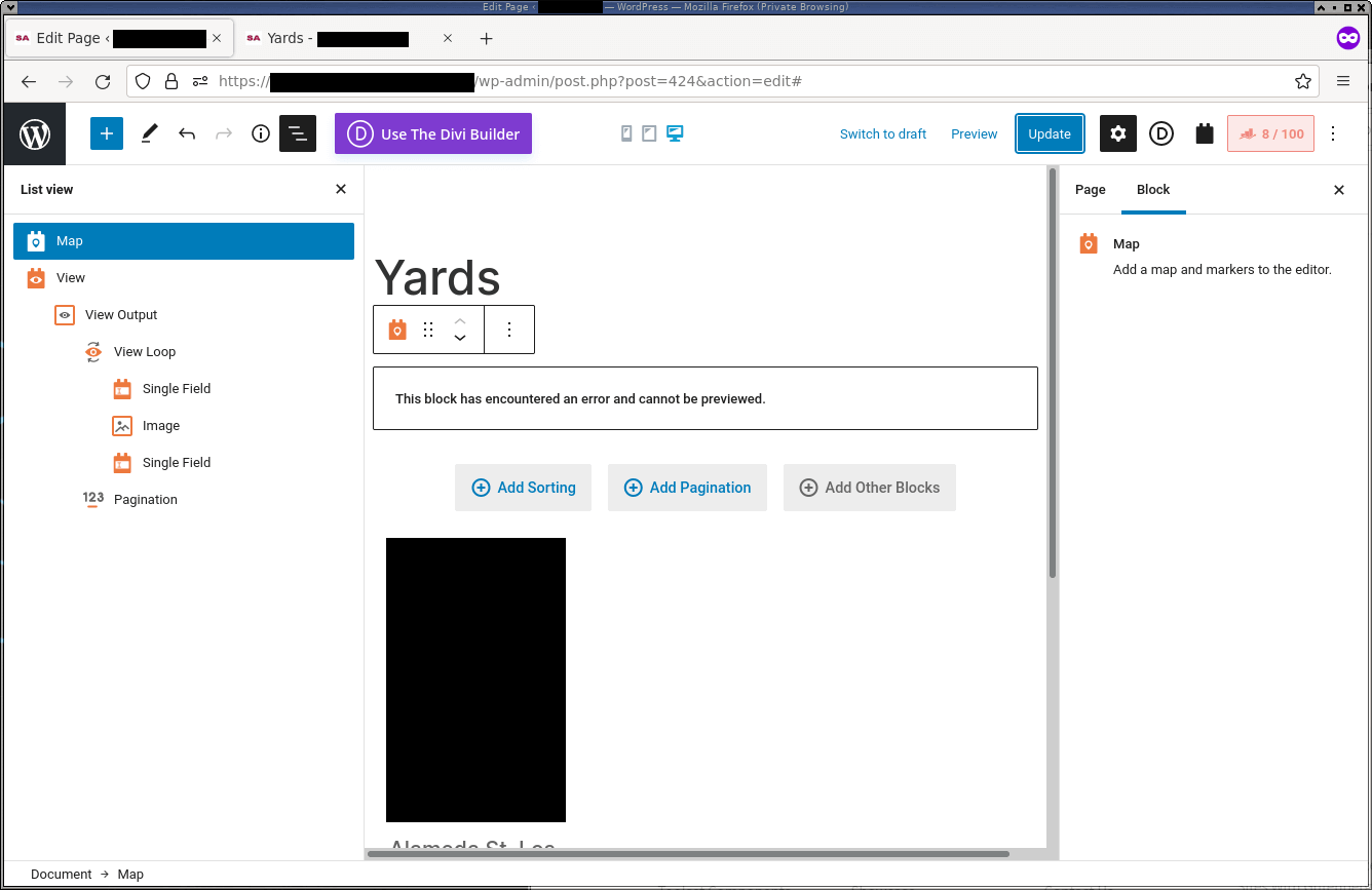 We are attempting to use the Maps component. We haven't managed to get it to work on this site for any use-case so far, both using a View as the data source and not. The screenshots I've attached are attempting to use a View as the data source (in the block editor).