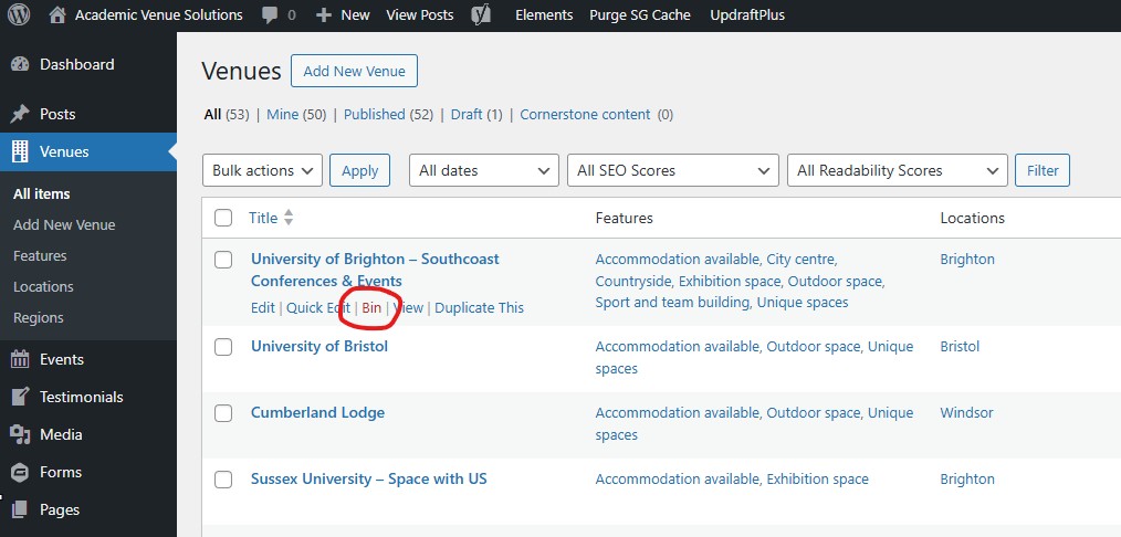 I expected to see: We have deleted the Venue (custom post type) Putteridge Bury but it is still showing on the map North East of Luton (see image).