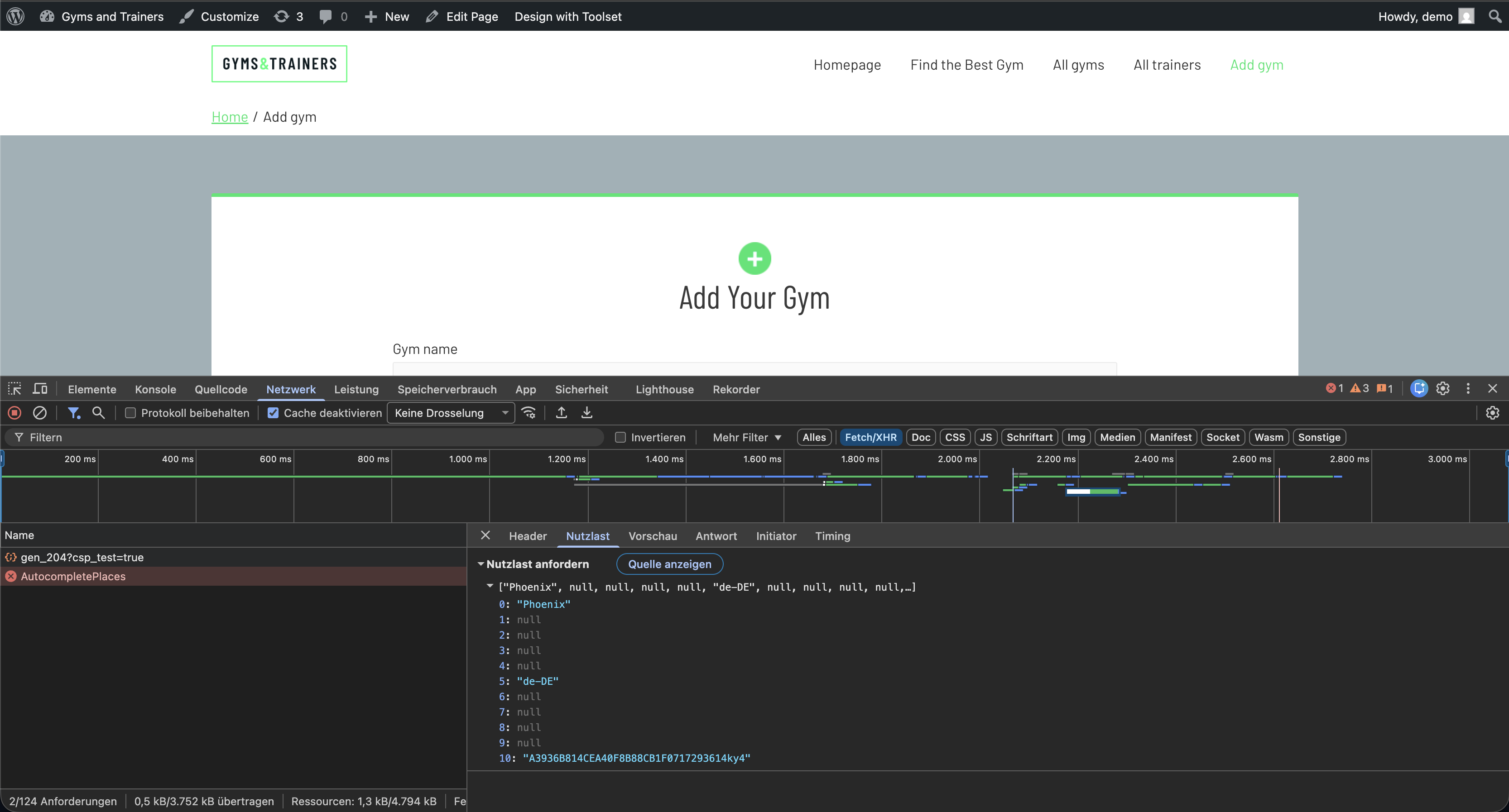 Thank you very much for your feedback. I don’t think we’ve quite got to the bottom of the problem yet. All our customisations should be in order. The issue is that on our website, and also on the test site you provided, a request containing the word ‘Phoenix’ is sent to the Google API even before any input is entered. This request is executed as soon as the page is loaded. This behaviour is also visible on your test site.