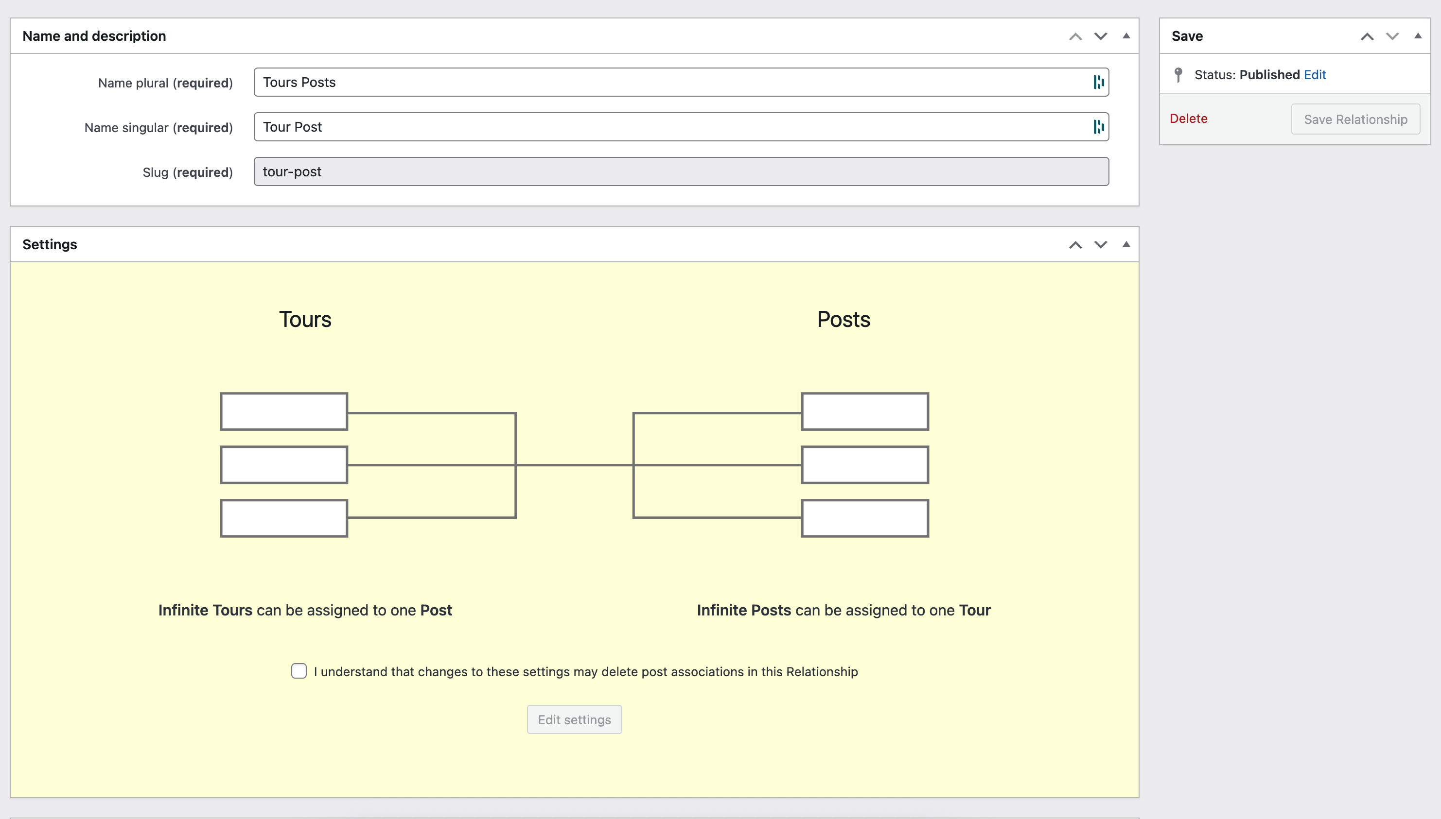 1- There is a Toolset post-relationship between the two post types (your Tours ↔ Posts).