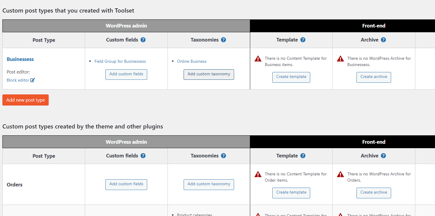 The red alerts are just a message to show that you do not have a content template or archive for the custom post types of your website.