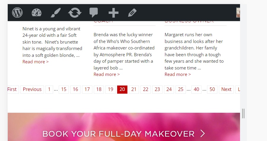 Instead, I got: You will notice, when clicking on page 6, the pagination then displays the next 5 pages (ie. page 6 to 11). This makes the pagination area wider as it starts to display more pages (instead of skipping 20 pages). You will notice on my screenshot that as you move through the pages, the pagination eventually falls off the side of the page. This is especially on mobile but it seems to happen on larger screens on certain devices/browsers.
