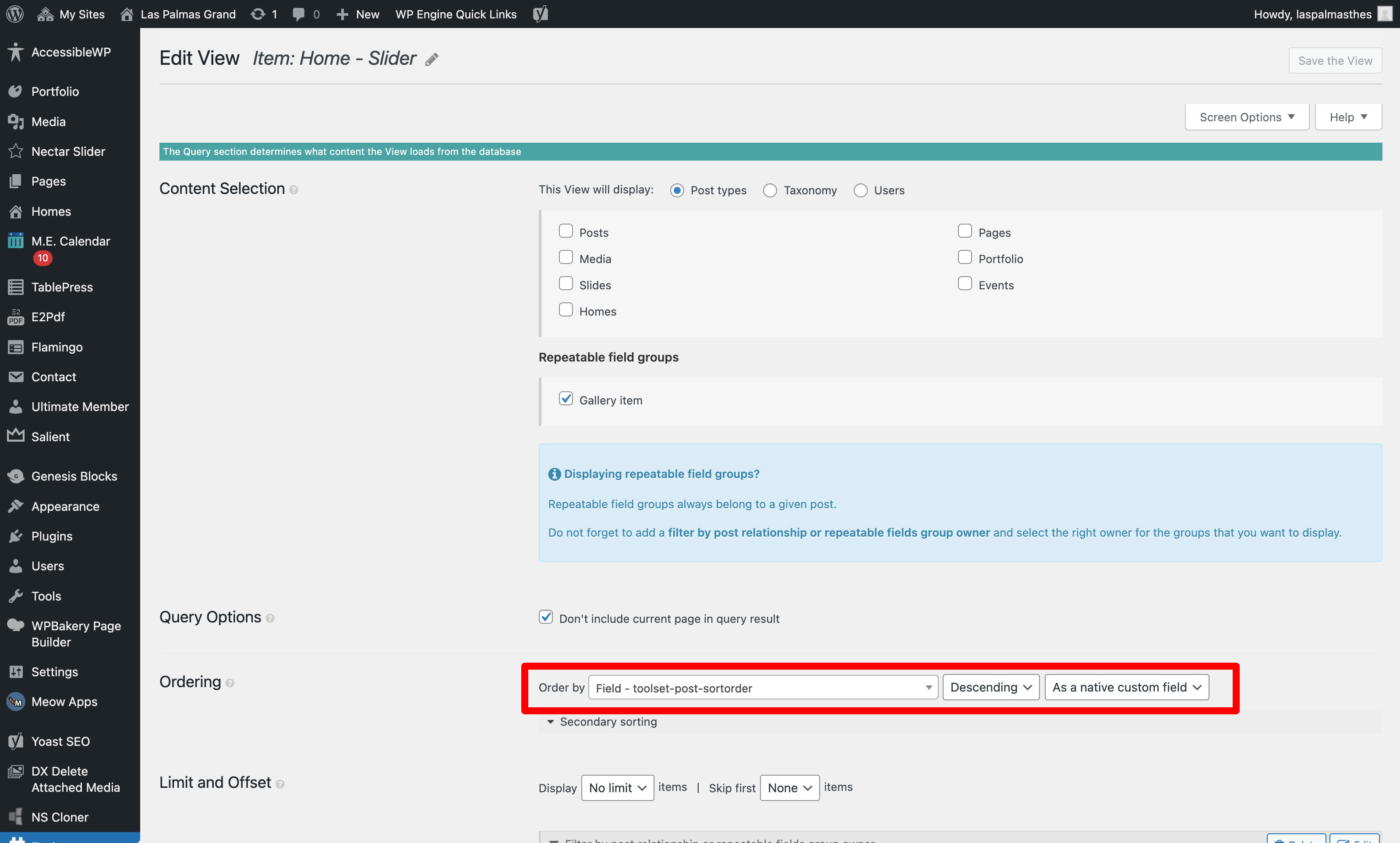 This is the page where I've added the above view to display repeating field group items and I can see that it does display the correct results either I set the view to display items order by "Field - toolset-post-sortorder" ASC or DESC :