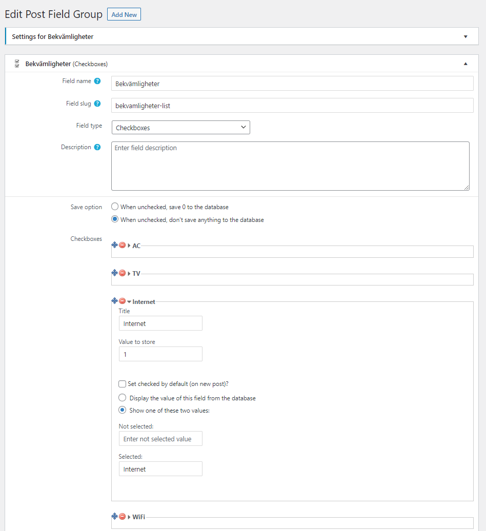 I have a custom fields group called "Bekvamligheter" (Facilities) and field type is "Checkboxes".