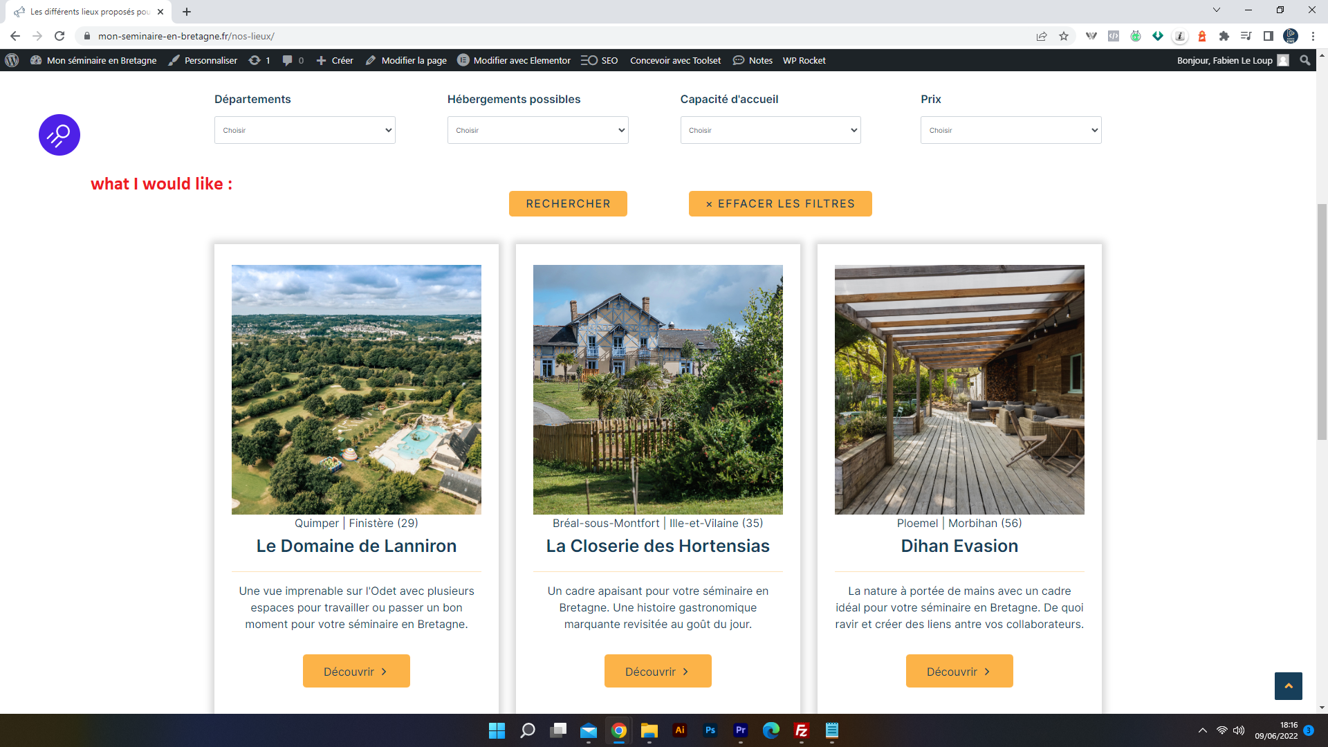 Je travaille avec Toolset et Elementor pour la construction de mon site mon-seminaire-en-bretagne.fr. J'utilise le thème Ocean WP et j'ai configuré un filtre pour la page Nos Lieux avec l'affichage des résultats en Grid avec 3 colonnes. Cependant, lorsque je vais sur la page Nos Lieux, seulement une colonne se met avec tous les éléments à la suite. En plus de cela, le bouton que j'ai ajouté n'a pas les couleurs que je lui ai demandé.. Que dois-je faire ?