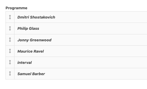 In the backend of each event post we can see the listing. Beside each of these is a handle and I can move items up and down the list. In this instance I have moved Shostakovich to the top, but on the front end this change isn't updated, as shown in the second image.