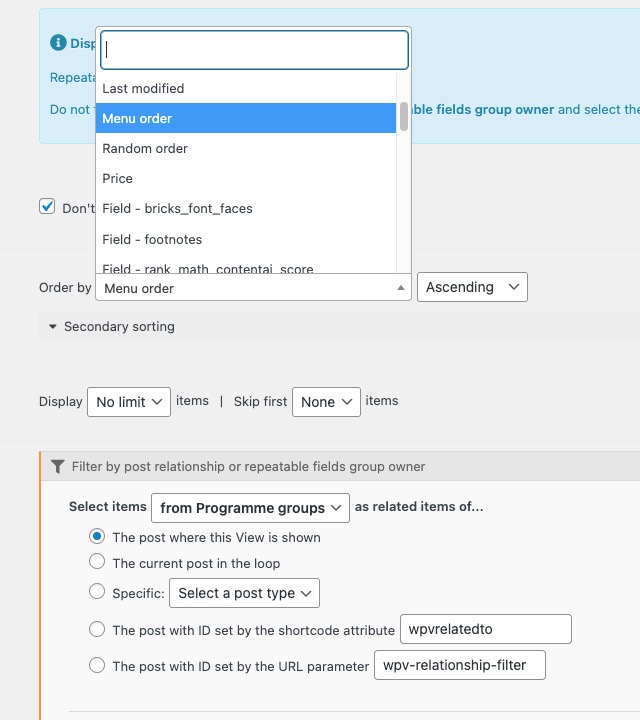 In the Views interface I can set up the order and there are several options. I tried the Menu order option but this does nothing. Ichecked Random order and this does set a random order on page relaod. Is there a particular option I should be using, or is it a case of setting up a programme order field (number) to control this. The handled reordering on the back end suggests that it would logically be the way to control this. As it is when there is a programme change it means I have to remove many works and re add as per the new ordering.