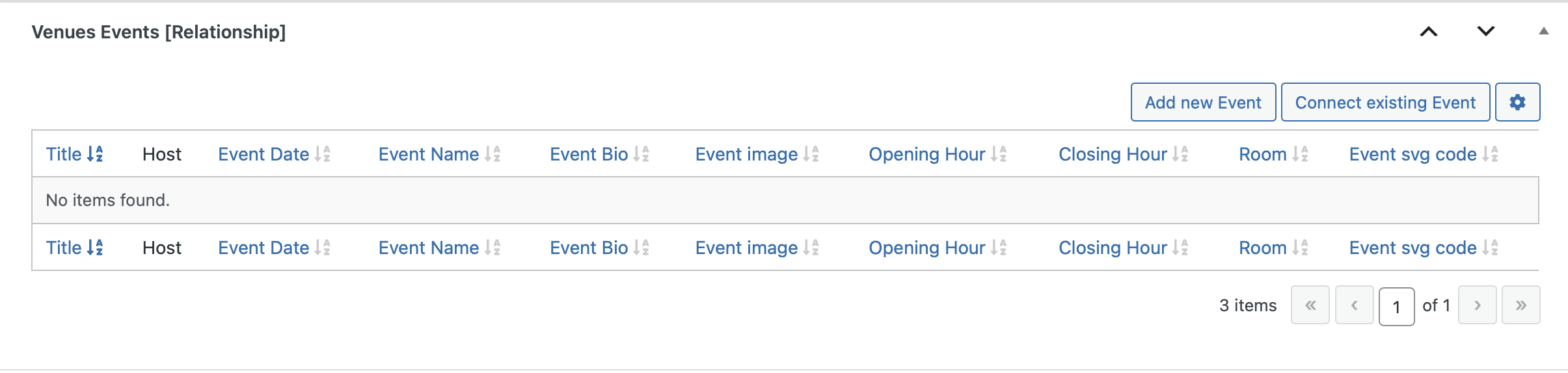 . Return to Toolset → Relationships → Venues ↔ Events, make sure that intermediary CPT is selected, Save.