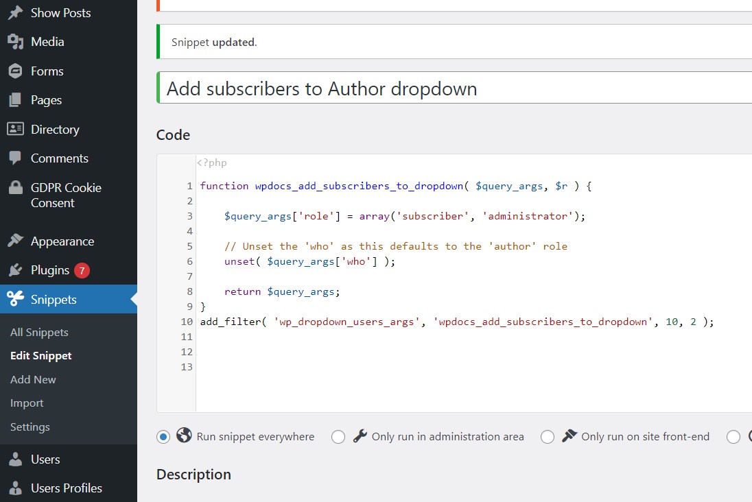 add_filter( 'wp_dropdown_users_args', 'wpdocs_add_subscribers_to_dropdown', 10, 2 );
