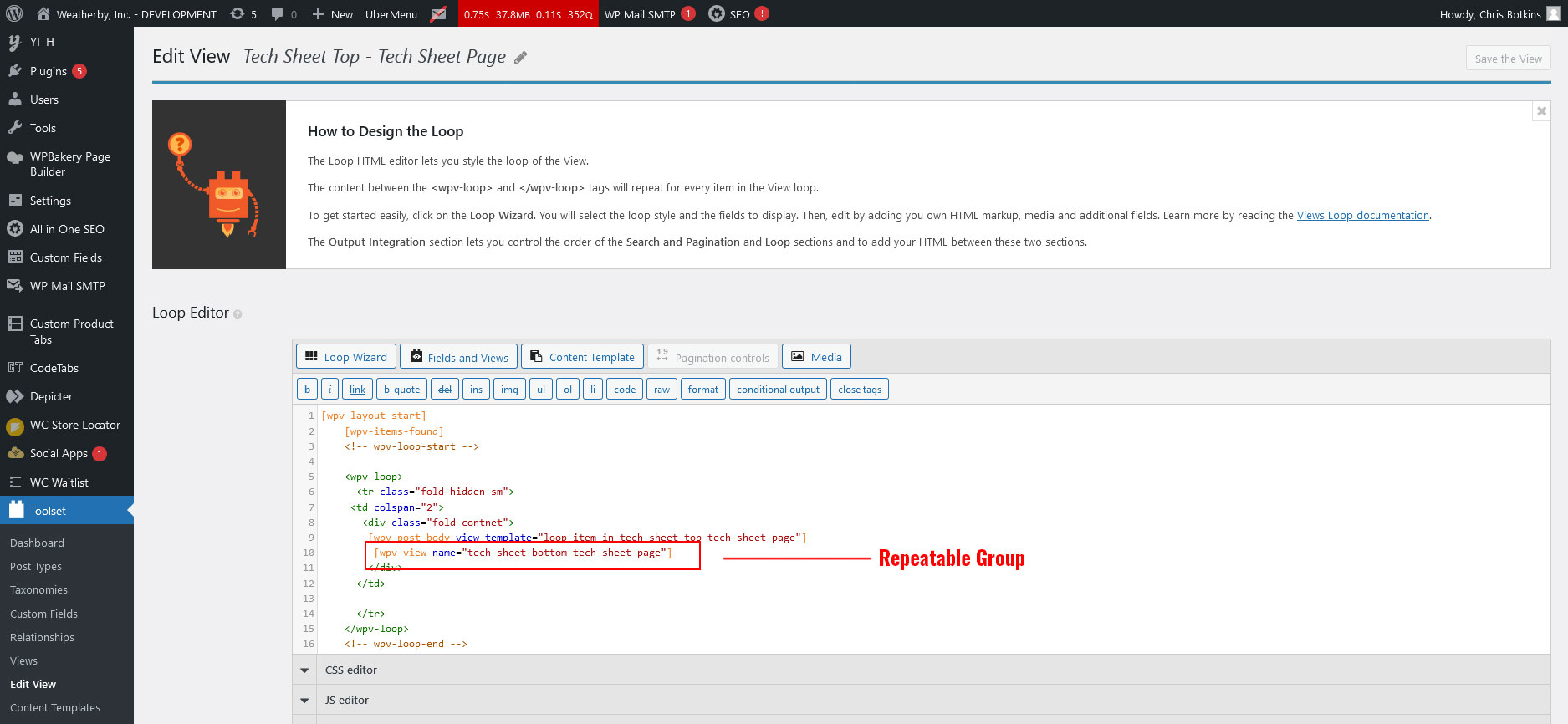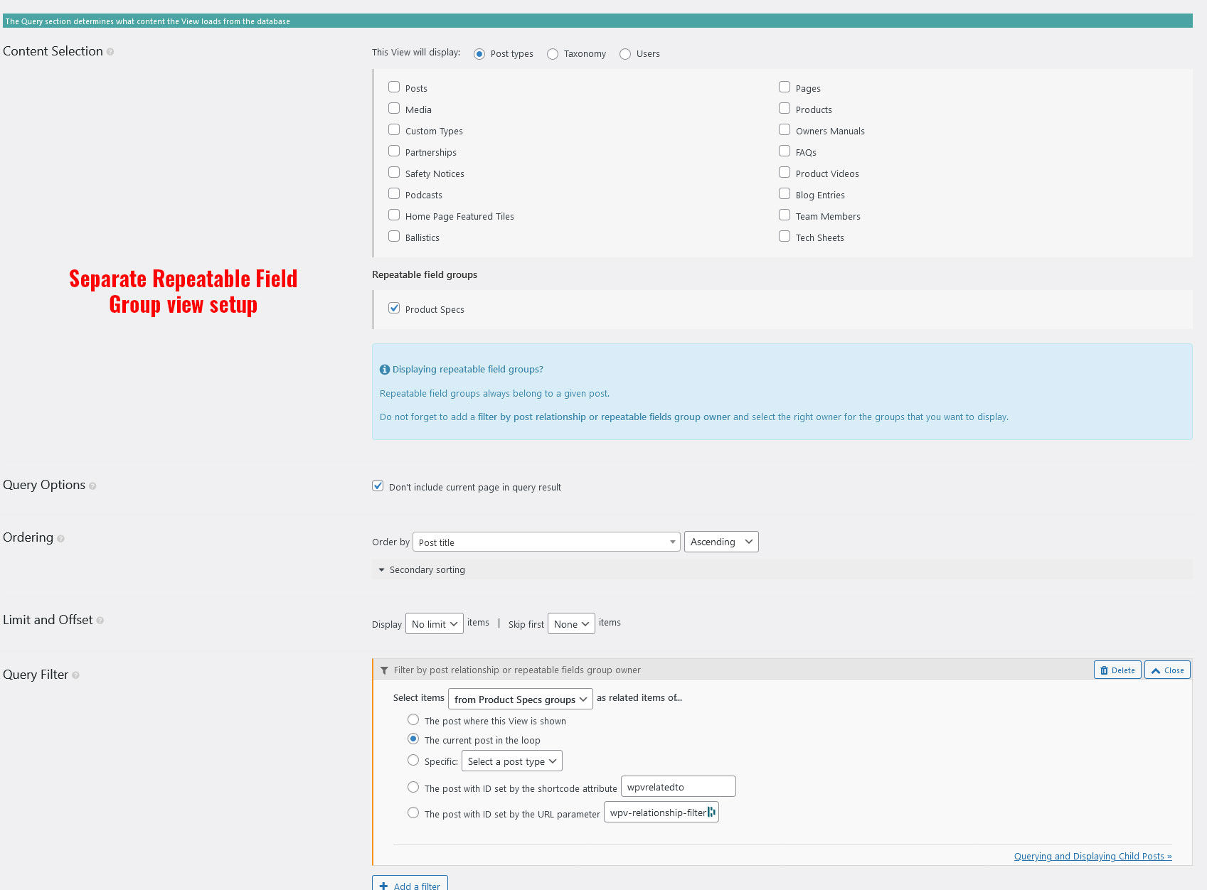 I have tried to configure a view for Product Specs, but nothing is working. No data is being pulled in. And I can't figure out how to get the Tech Sheet post type view to display the Product Specs repeatable group.